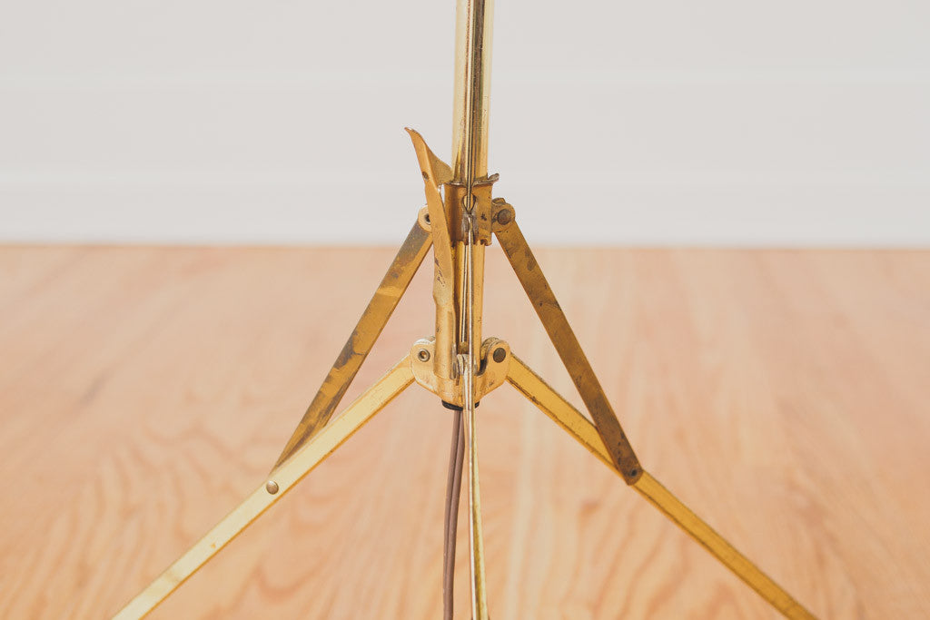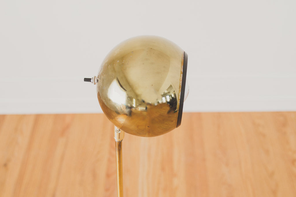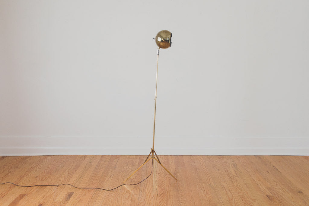 This Mid Century eyeball floor lamp has a gold finish with a folding tripod base. It's adjustable in height and direction and is in good working condition. Please see pictures for detailed condition.