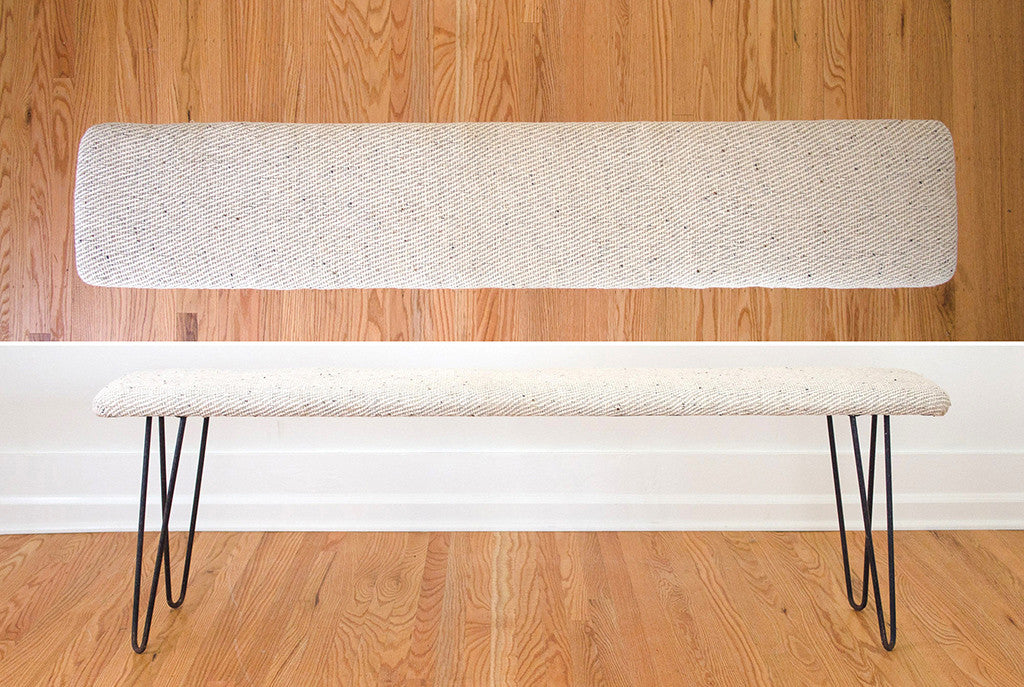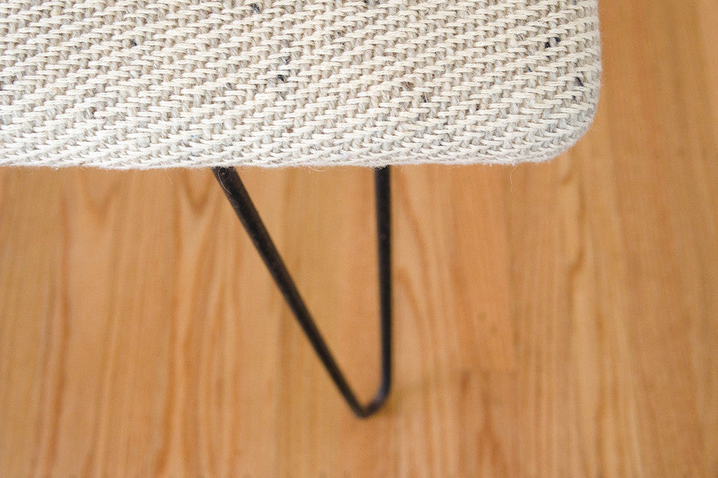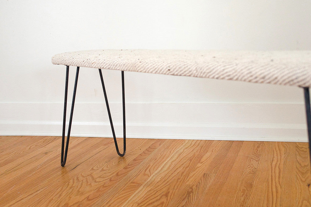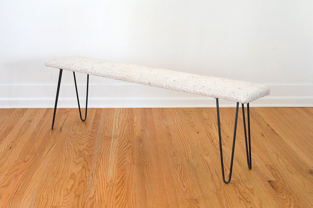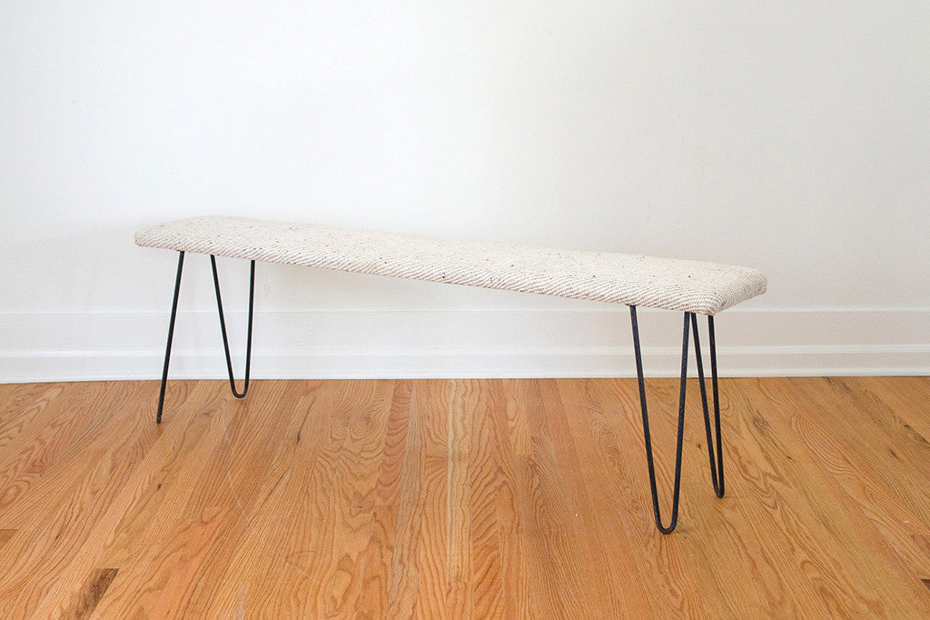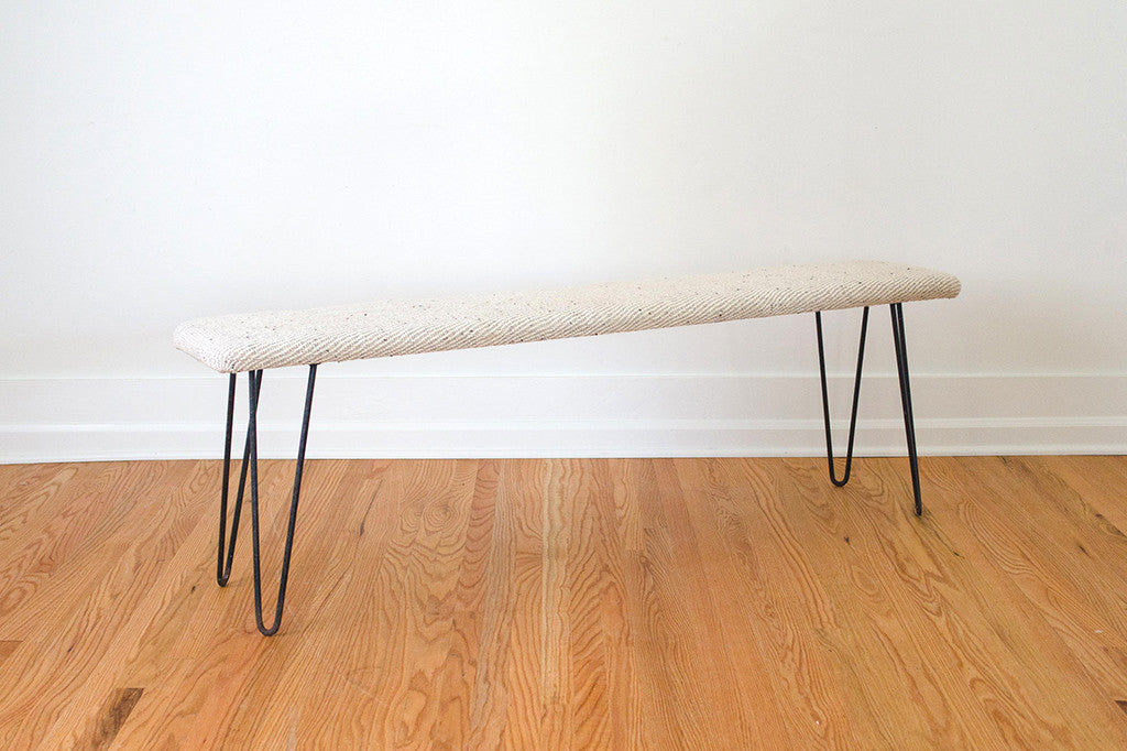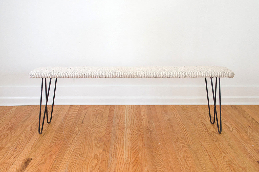 This Mid Century hairpin bench turned out really well. We had it upholstered in a vintage wool fabric that's cream with specks of black, gray and brown. It would look nice at the end of a bed and could also be used as a coffee table. Please see pictures for detailed condition of this piece.