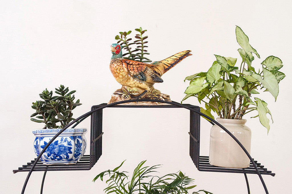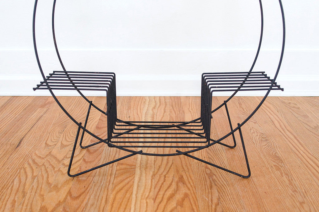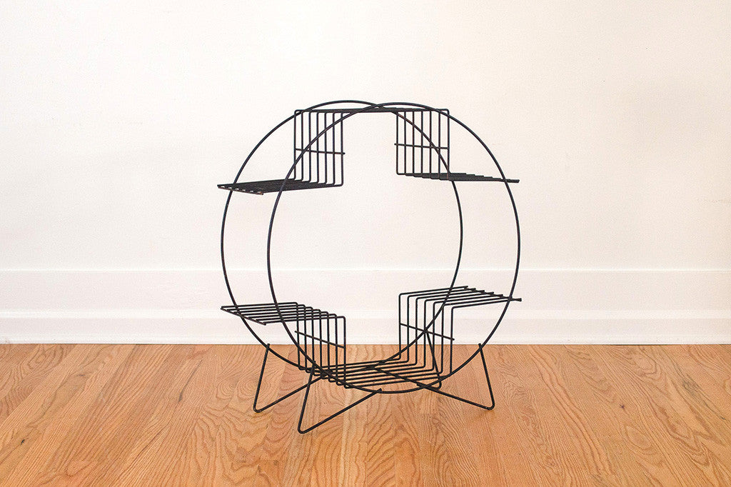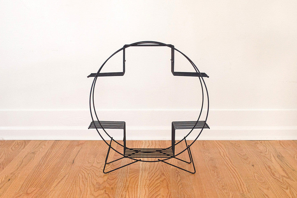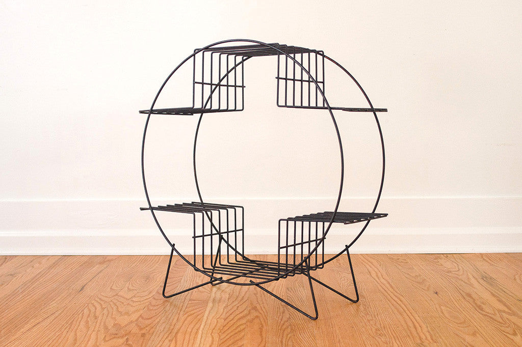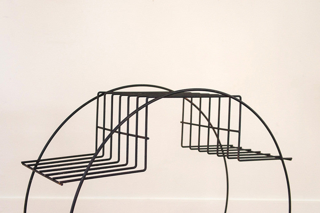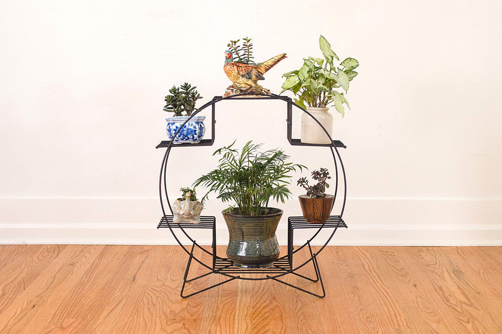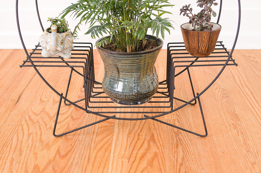 This vintage Mid Century plant stand has a black metal frame and hairpin legs. It has six spots for plants, books or whatever you collect. It's in overall excellent condition with some light age related wear. It has a similar look to Anthropologie's Kansai Bookcase. Please see pictures for detailed condition of this piece.