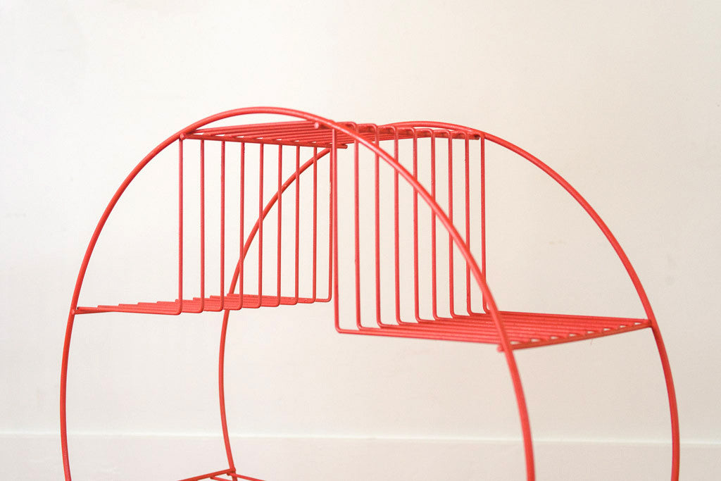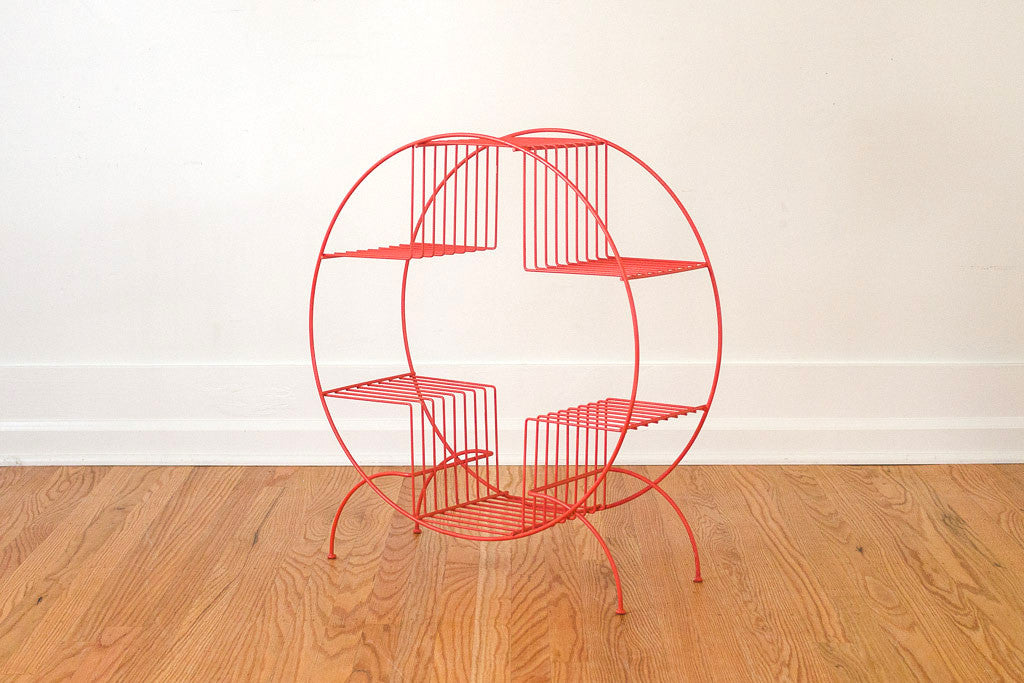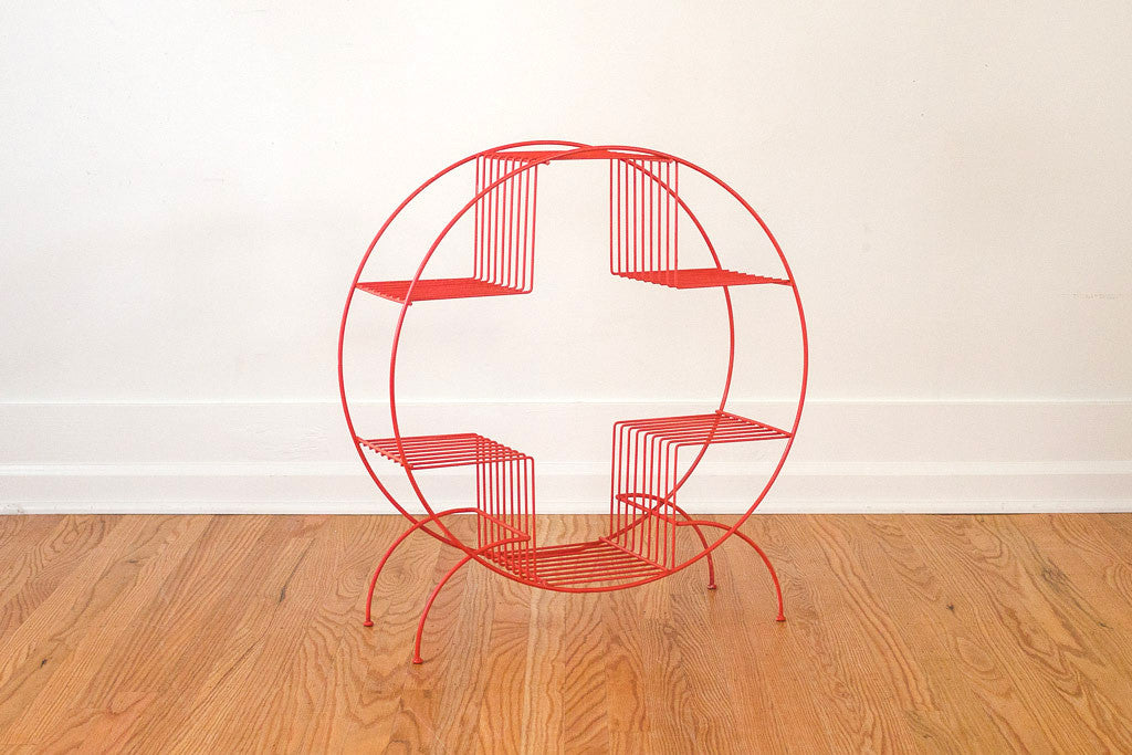 This vintage Mid Century plant stand has a neon red metal frame and hairpin legs. It has six spots for plants, books or whatever you collect. It's in overall excellent condition with some light age related wear. It has a similar look to Anthropologie's Kansai Bookcase. Please see pictures for detailed condition of this piece.