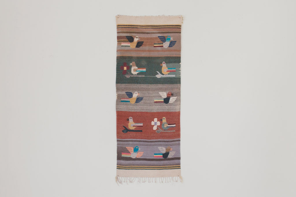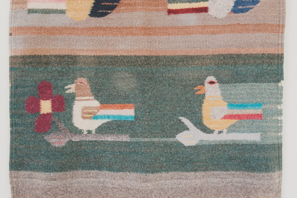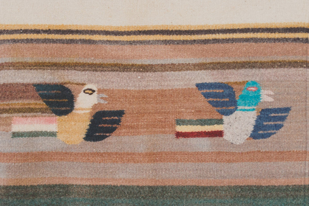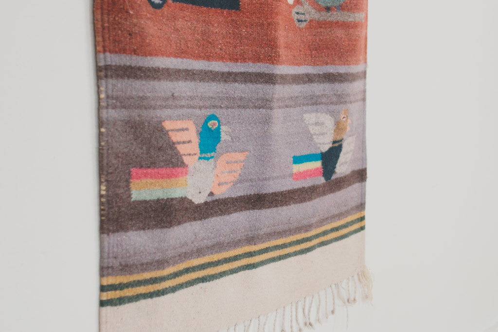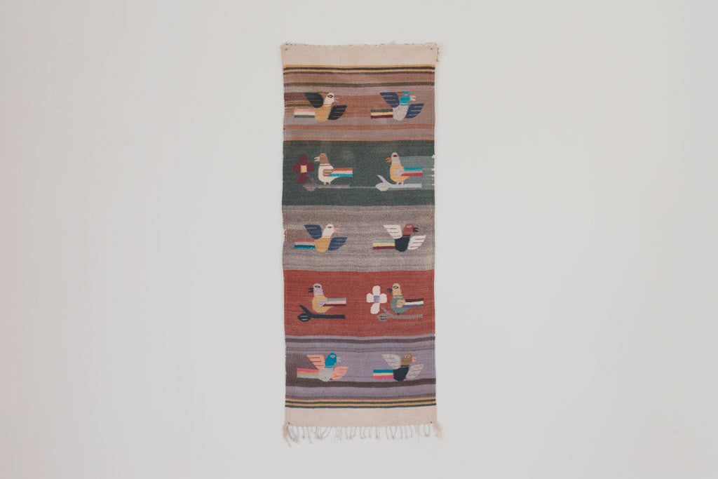 This Mid Century handwoven wool tapestry has a cream, grey, blue, red, green and black bird design and cream tassels on the bottom. It's in good shape with natural age related wear. Please see pictures for detailed condition.