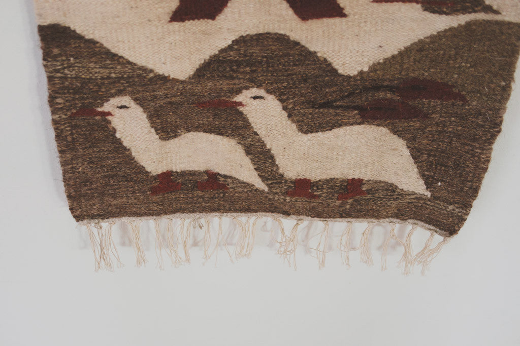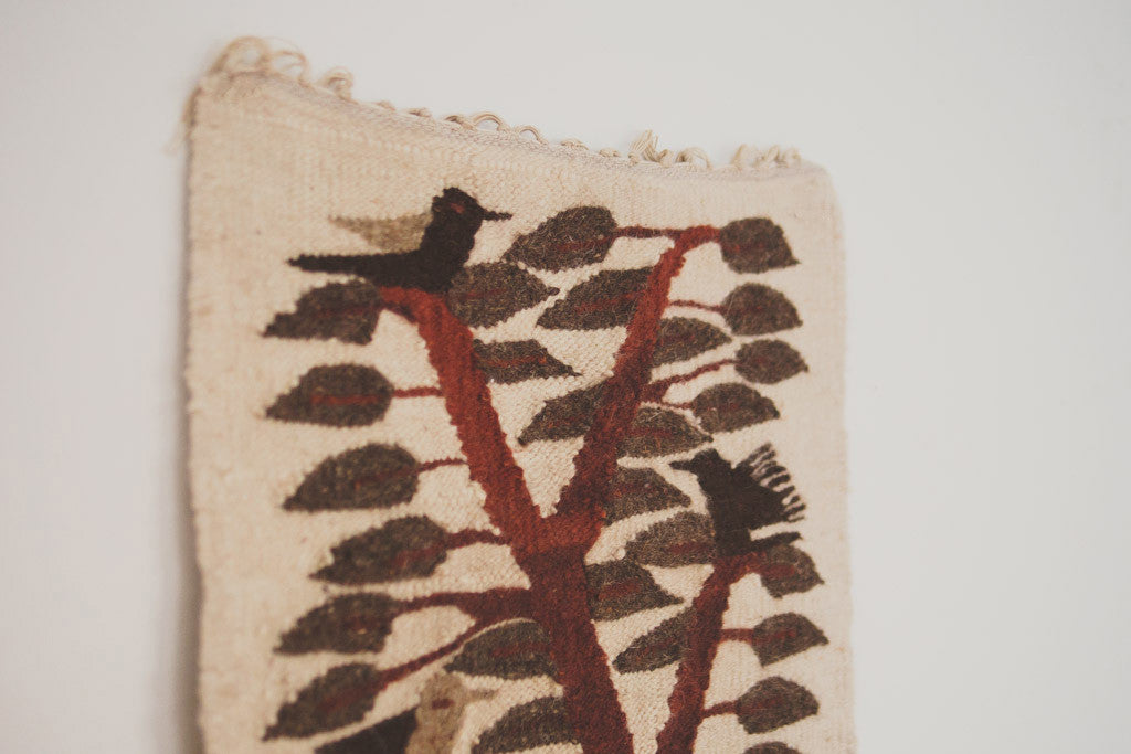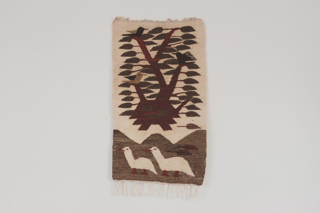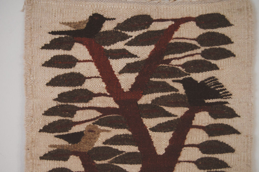 This Mid Century handwoven tapestry has a cream base with grey, brown and green accents. It's in good shape and has natural age related wear. Please see pictures for detailed condition.