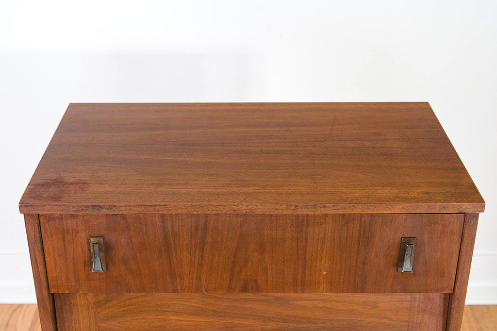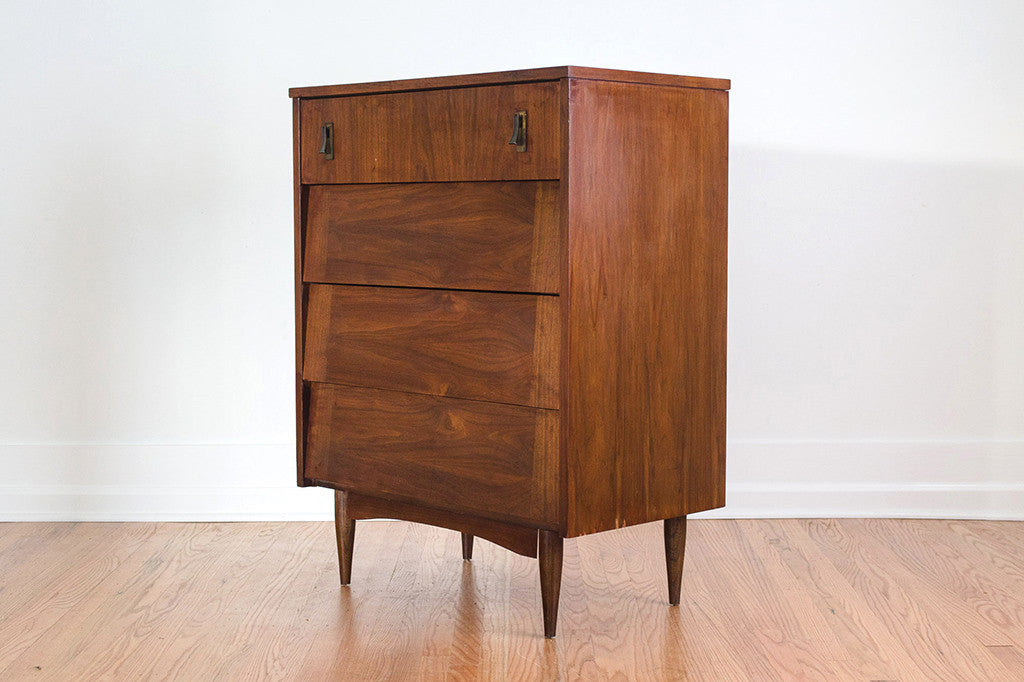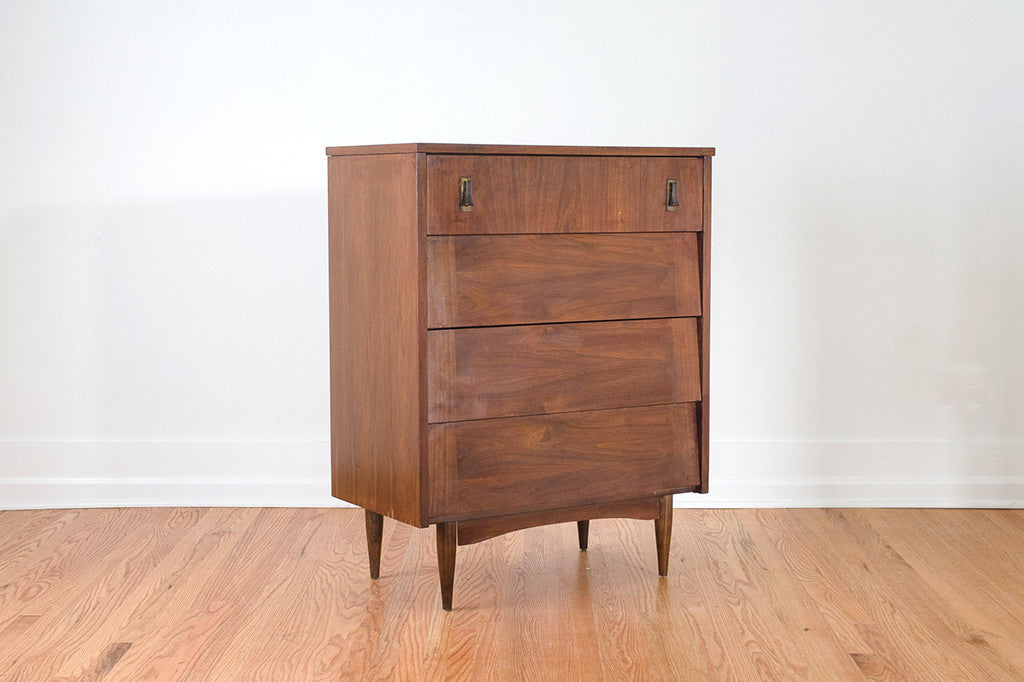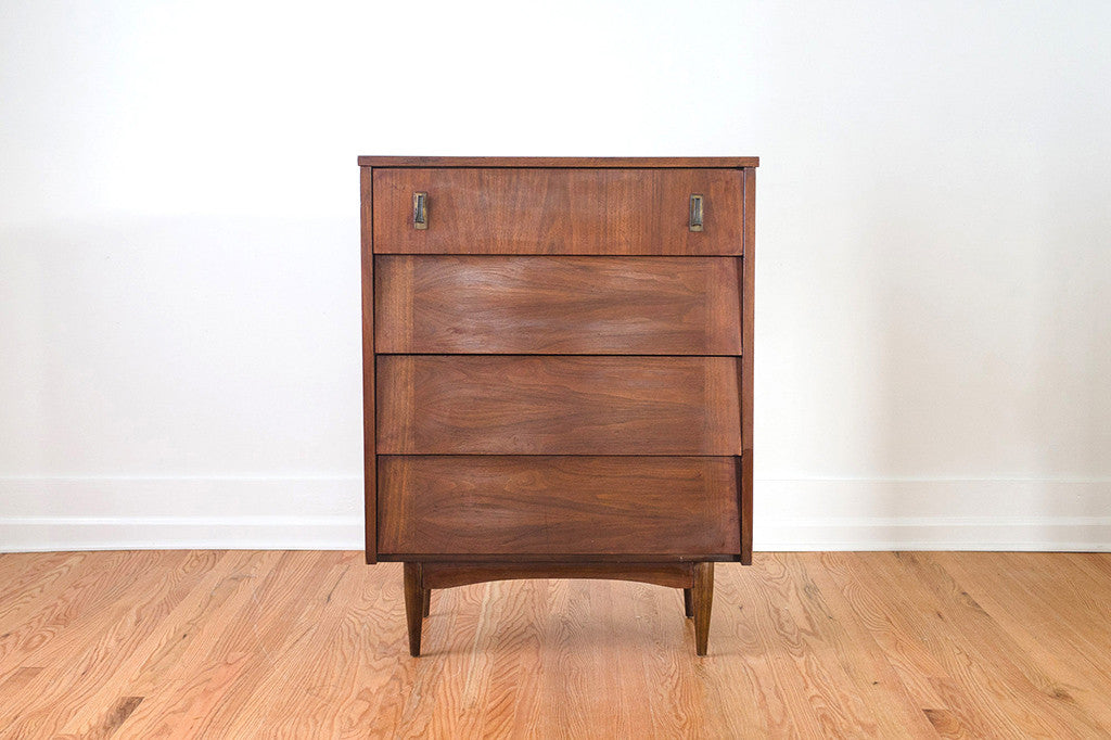 This Mid Century highboy dresser is a four drawer step front style in walnut