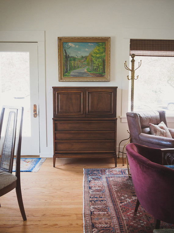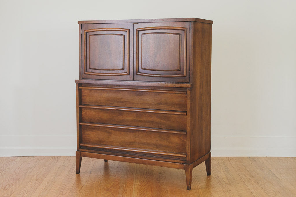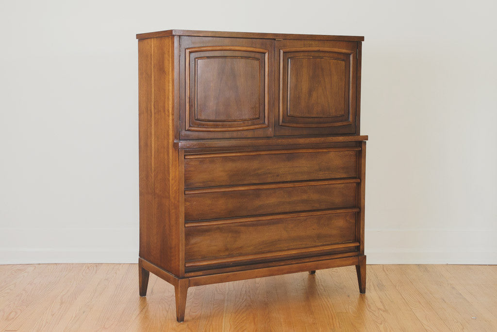 This Mid Century walnut highboy dresser has three lower drawers and two additional drawers behind french doors, peg legs and a wood top. It's in great shape with some age related wear. Please see pictures for detailed condition.