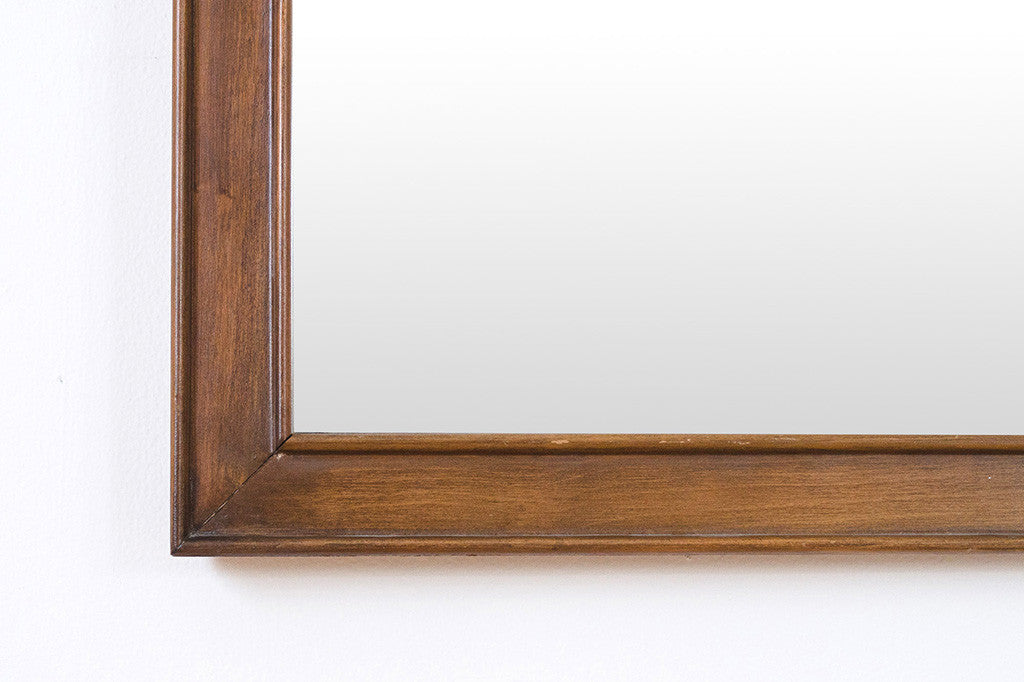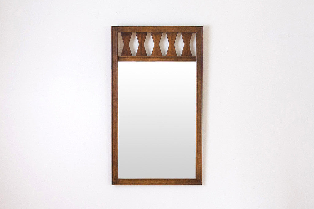 This vintage Mid Century mirror has a carved diamond and hourglass pattern wood frame. The mirror itself is in excellent shape and would be a nice addition over a bathroom vanity, above a dresser or in an entryway. It's wired and ready to hang. Please see pictures for detailed condition of this piece.