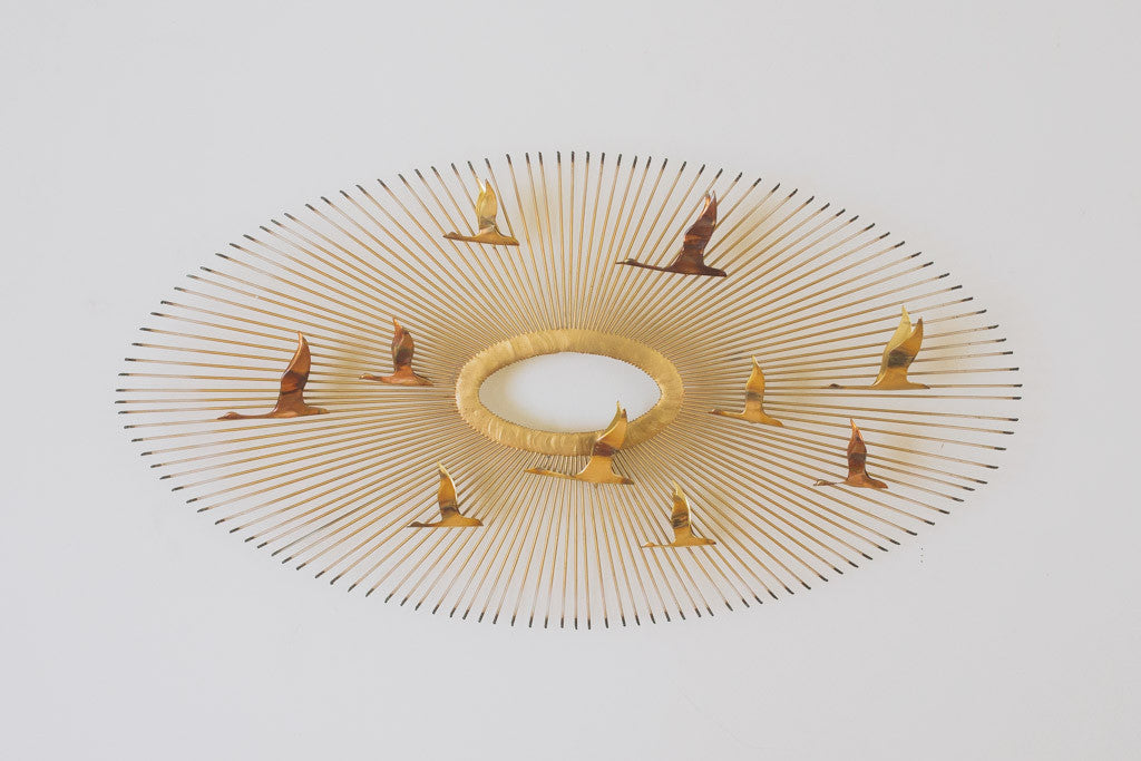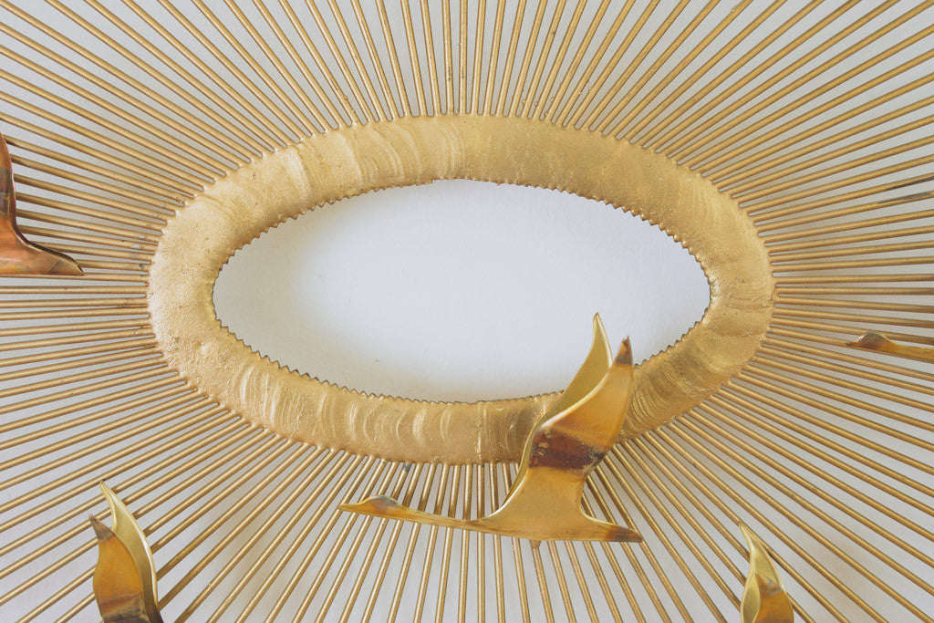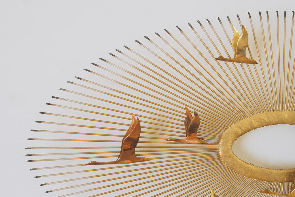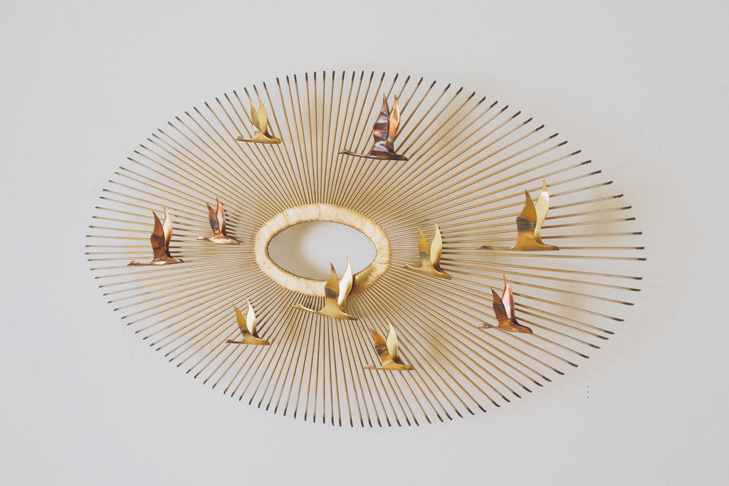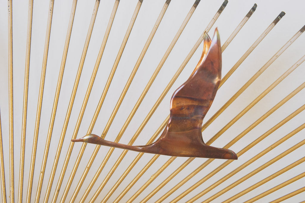 This Mid Century Jere era brass wall piece has sunburst arms that extend from the center with brass and copper bird accents. It's in good shape with age related wear. Please see pictures for detailed condition.