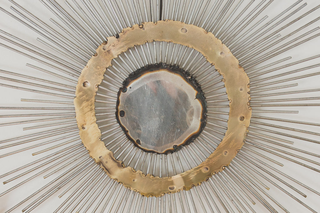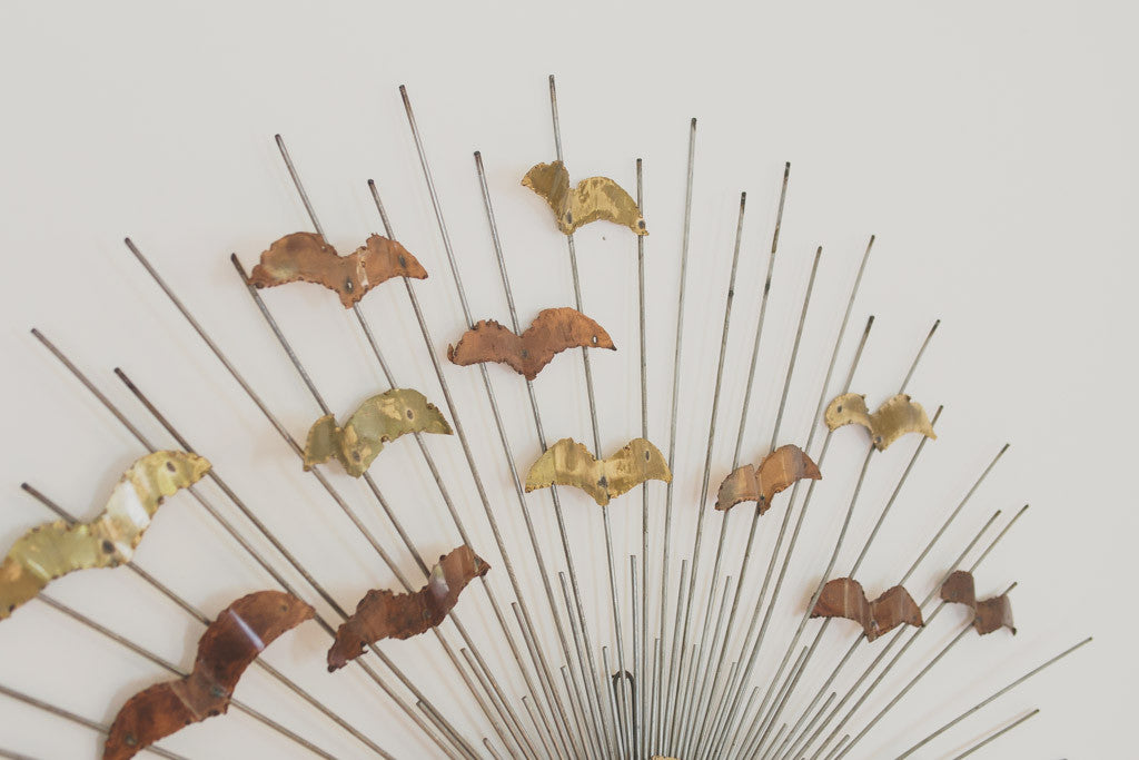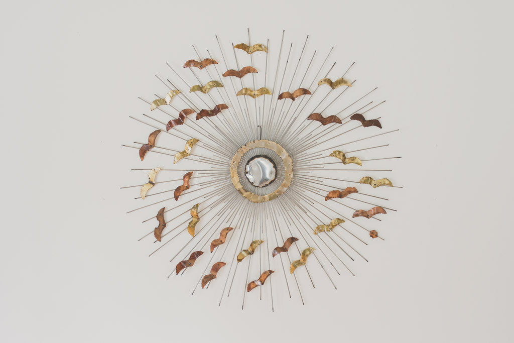 This vintage Mid Century steel and copper sunburst sculpture is circular with metal birds within the spokes. It's in excellent shape with light age related wear. Please see pictures for detailed condition.