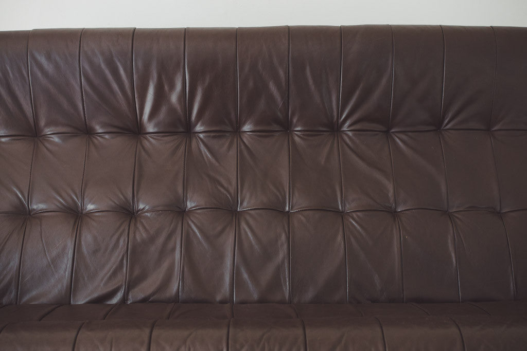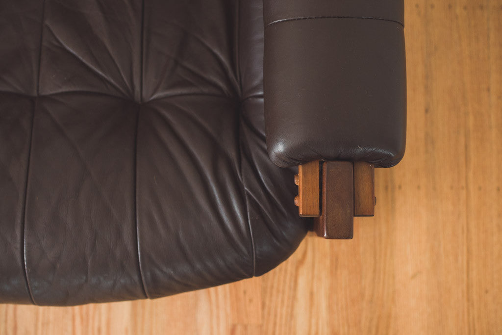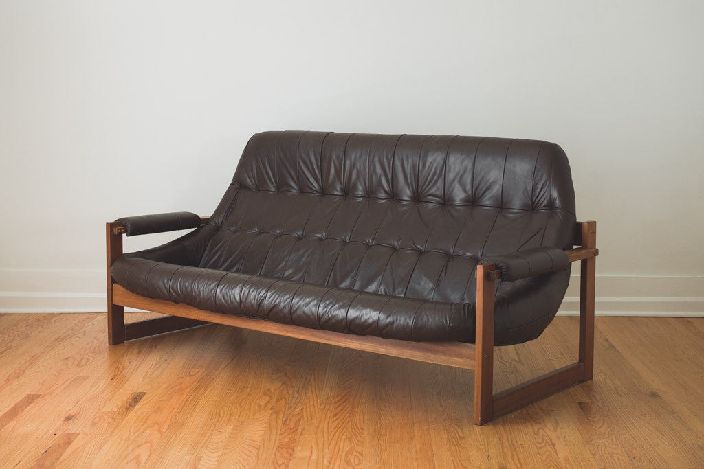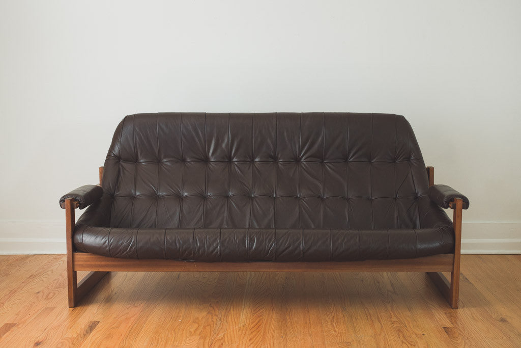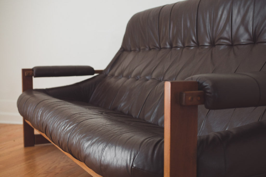 This Mid Century sofa was designed by Percival Lafer and manufactured in Brazil. It's upholstered in tufted brown leather with a solid rosewood frame. It's in great shape with age related wear. See pictures for detailed condition.