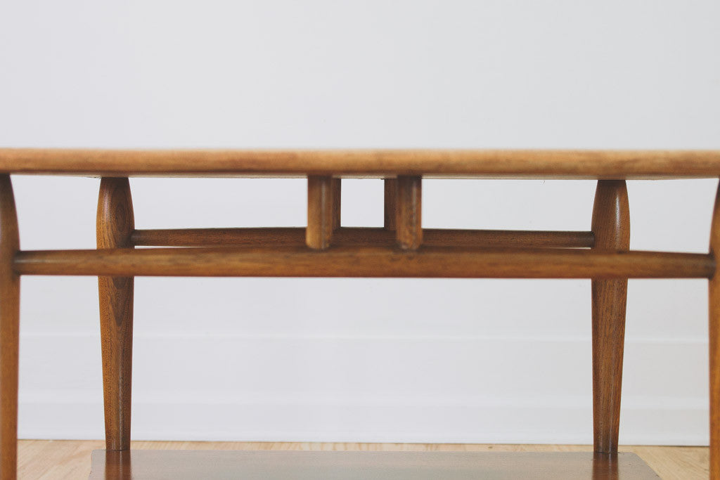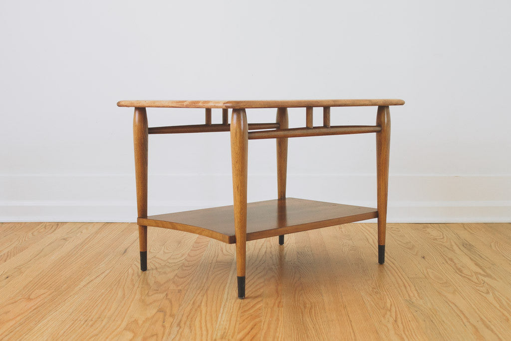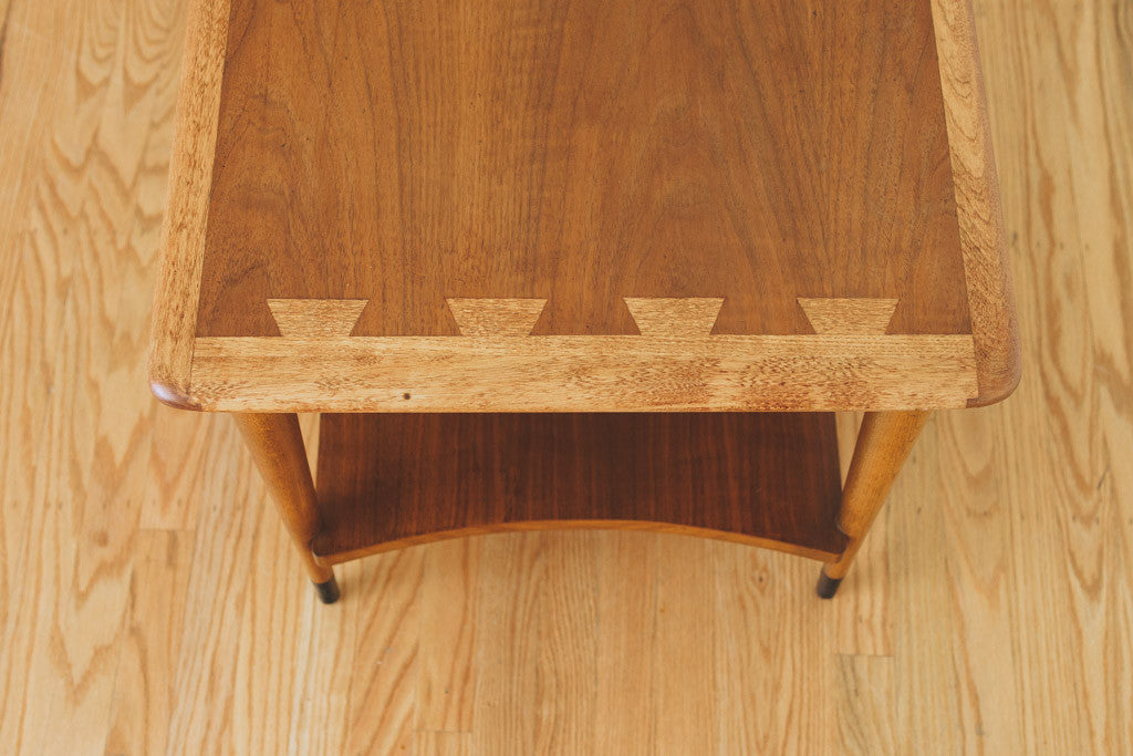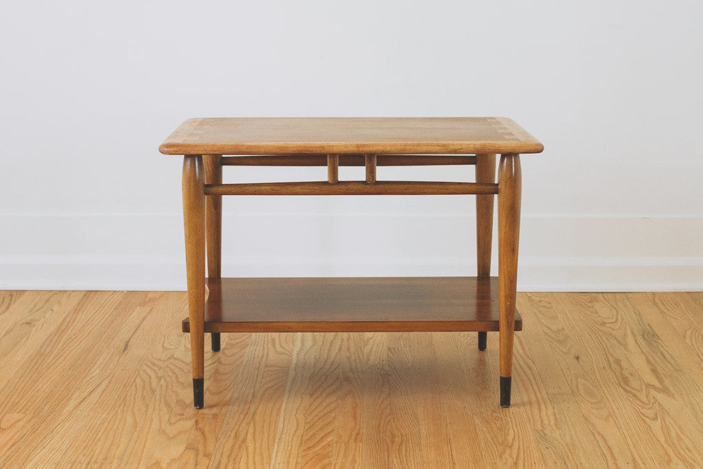 This vintage Mid Century side table was manufactured by Lane. It's walnut with two shelves and is in good shape with age related wear. See pictures for detailed condition.