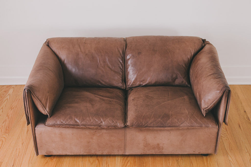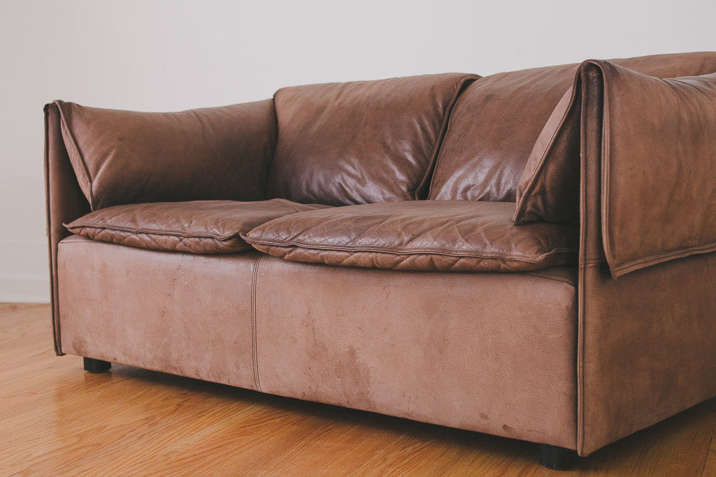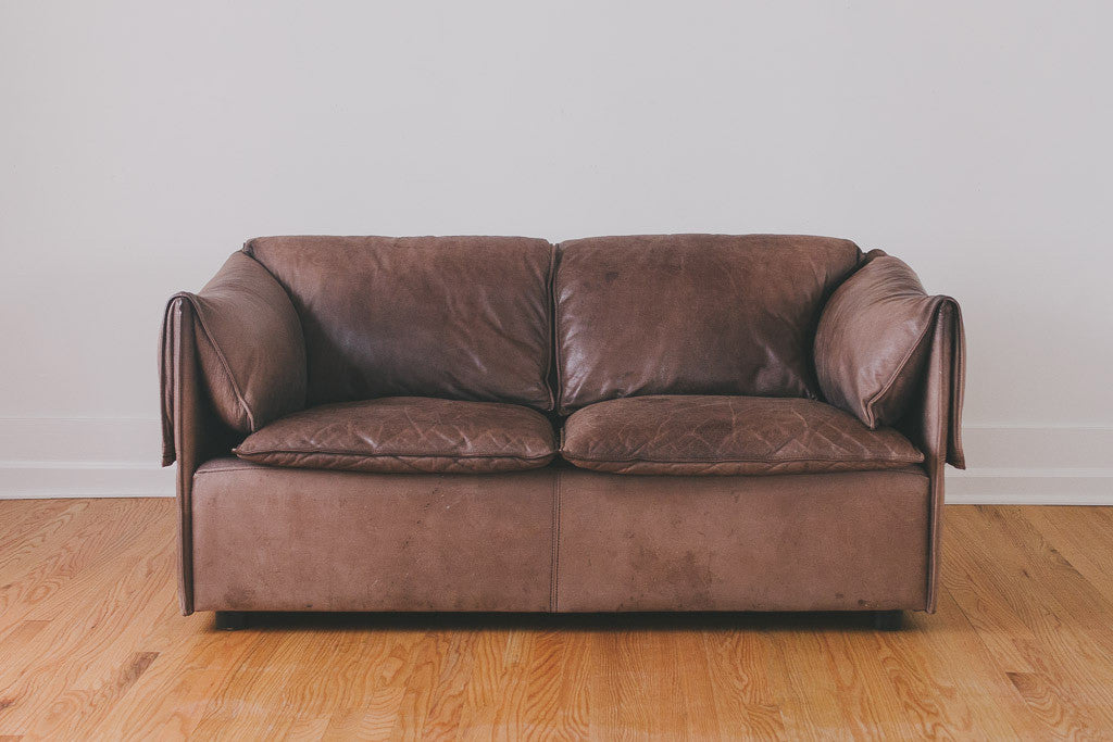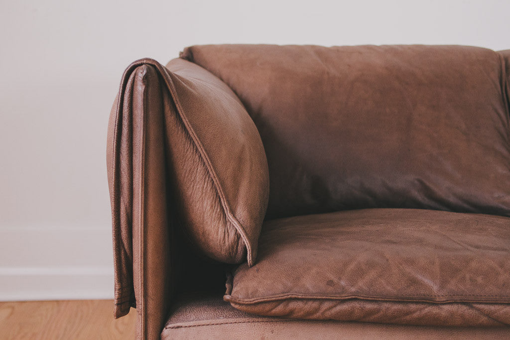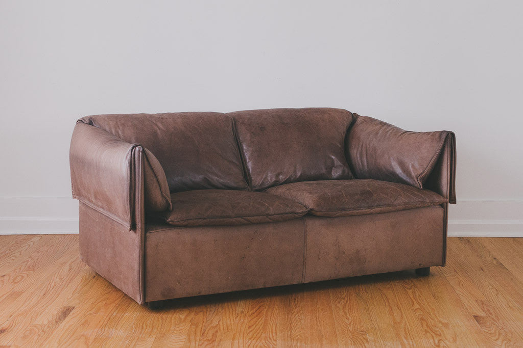 This Mid Century Danish N. Eilersen Luna style sofa is brown leather. It has deep, comfortable seating and the leather upholstery is thick, soft and naturally worn. It's in good condition with some age related wear. Please see pictures for detailed condition.
