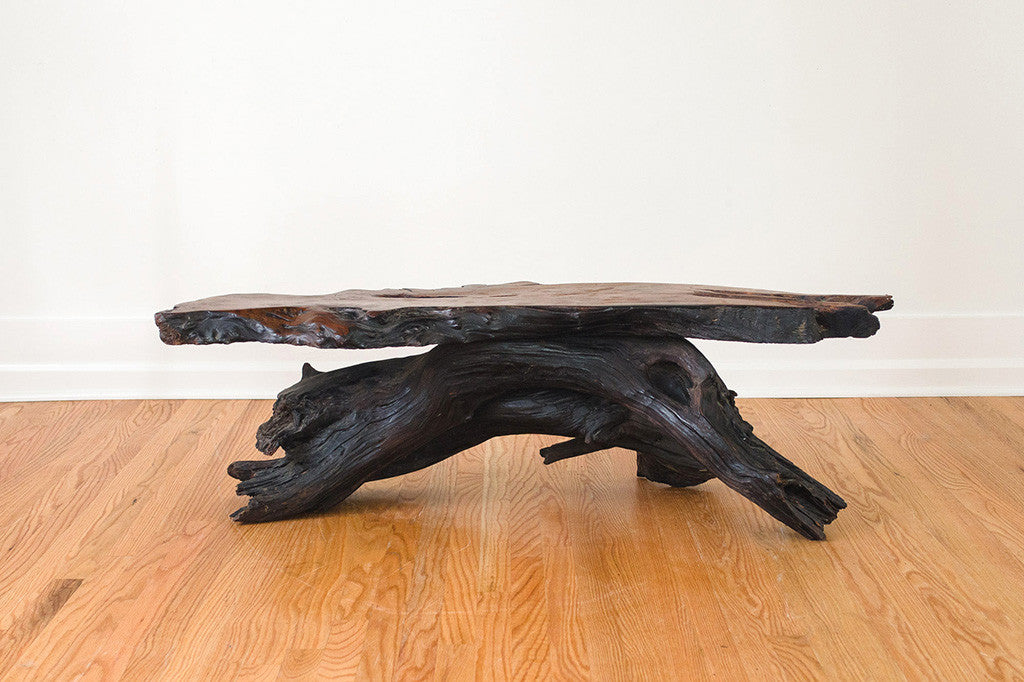 We have a really special live edge slab coffee table in the shop. It has a dark oiled finish and a trunk base. It works really well with Mid Century or rustic decor. Please see pictures for detailed condition of this piece.
