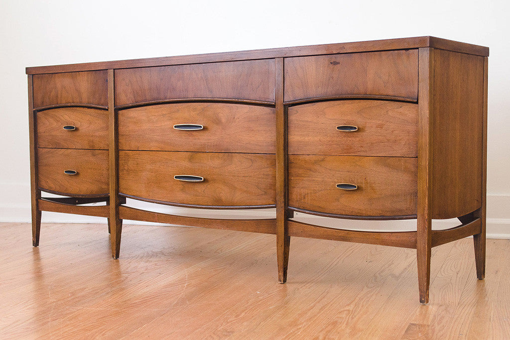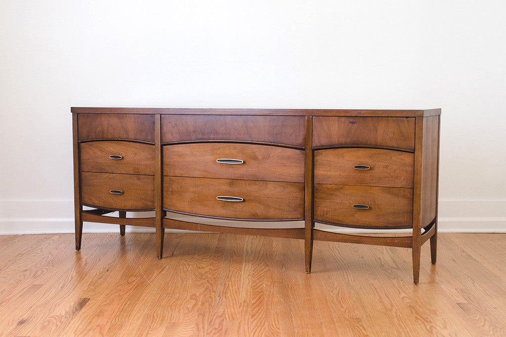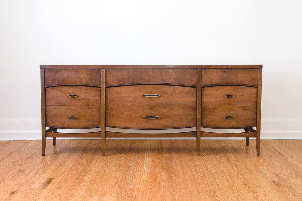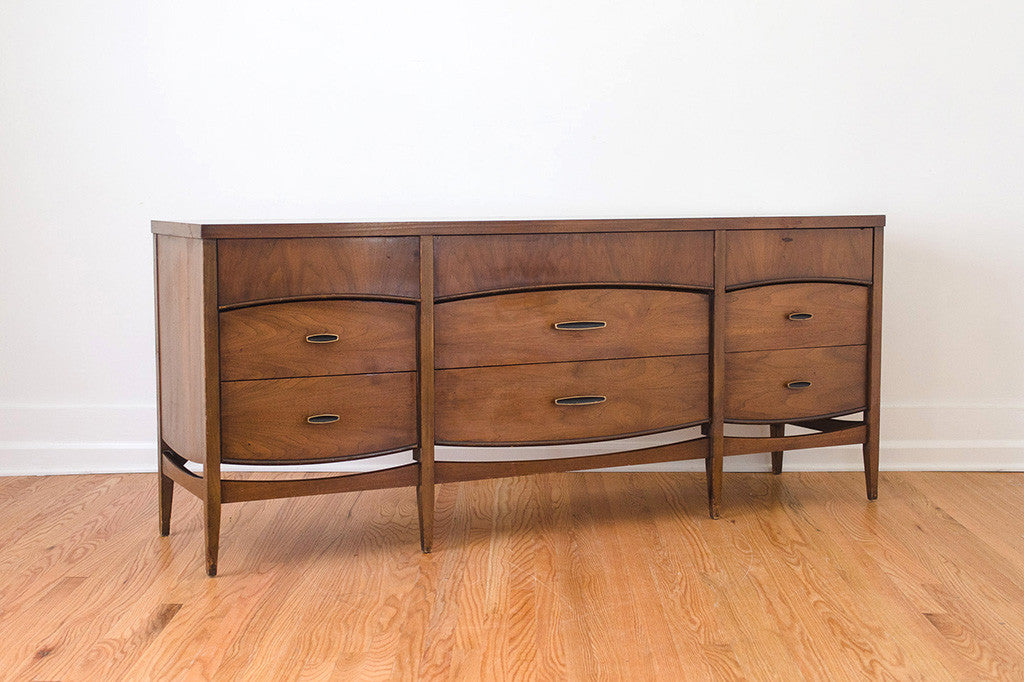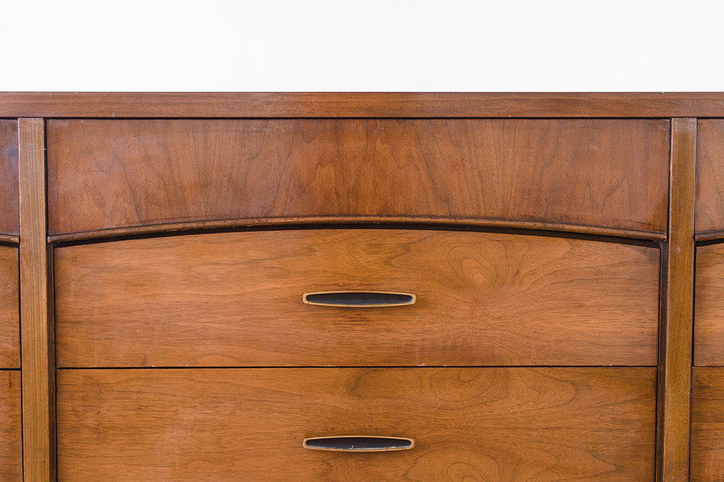 This vintage Mid Century walnut dresser has a nice silhouette. It's a nine drawer lowboy style with a generous amount of storage space. It has really stunning brass hardware and curved details. The top is a well matched wood grain hard surface, perfect especially if you wanted to use this piece as a buffet or credenza. Please see pictures for detailed condition of this piece.