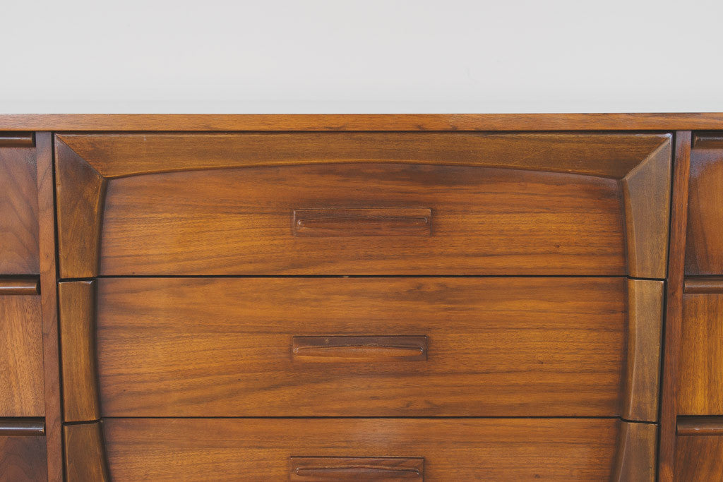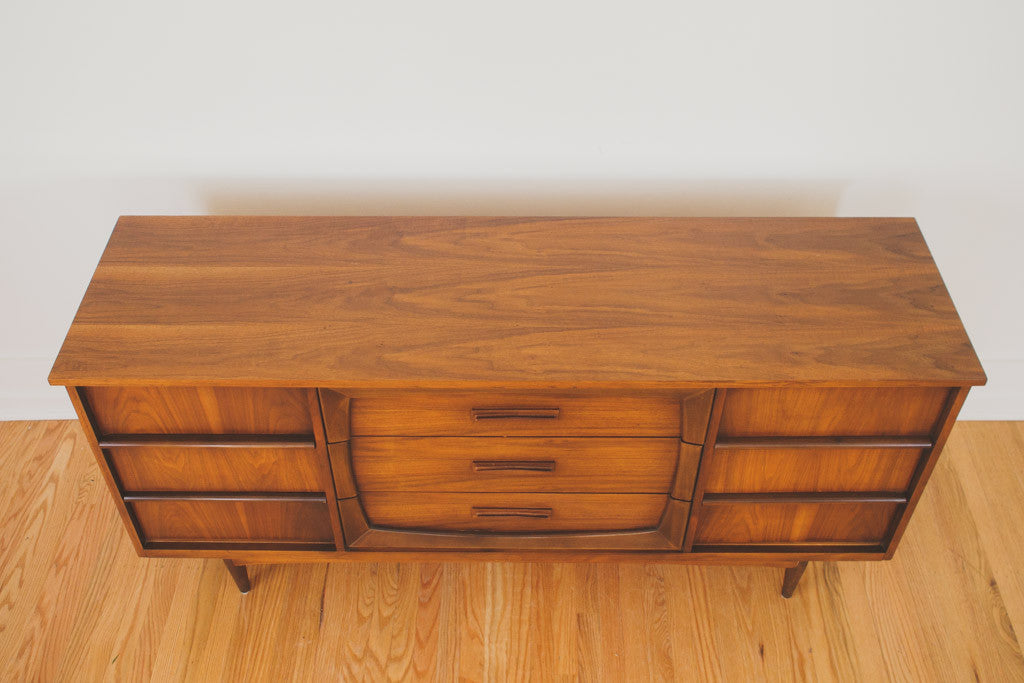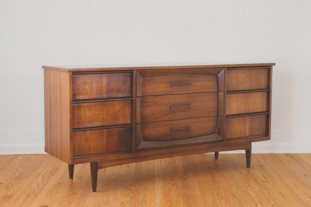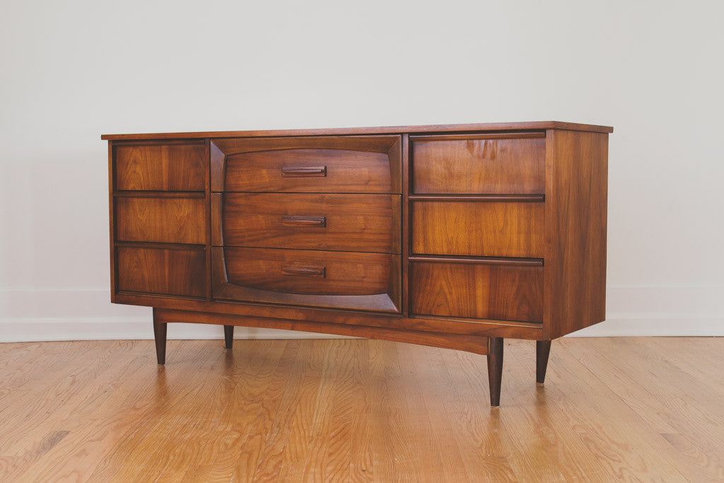 This Mid Century walnut nine drawer lowboy dresser has wood pulls, peg legs and a solid wood top. It's in good shape with some age related wear including some veneer bubbling on one of the drawers. It could also be used as a credenza, sideboard or buffet. Please see pictures for detailed condition.