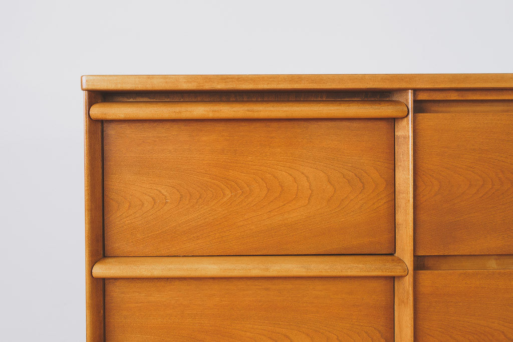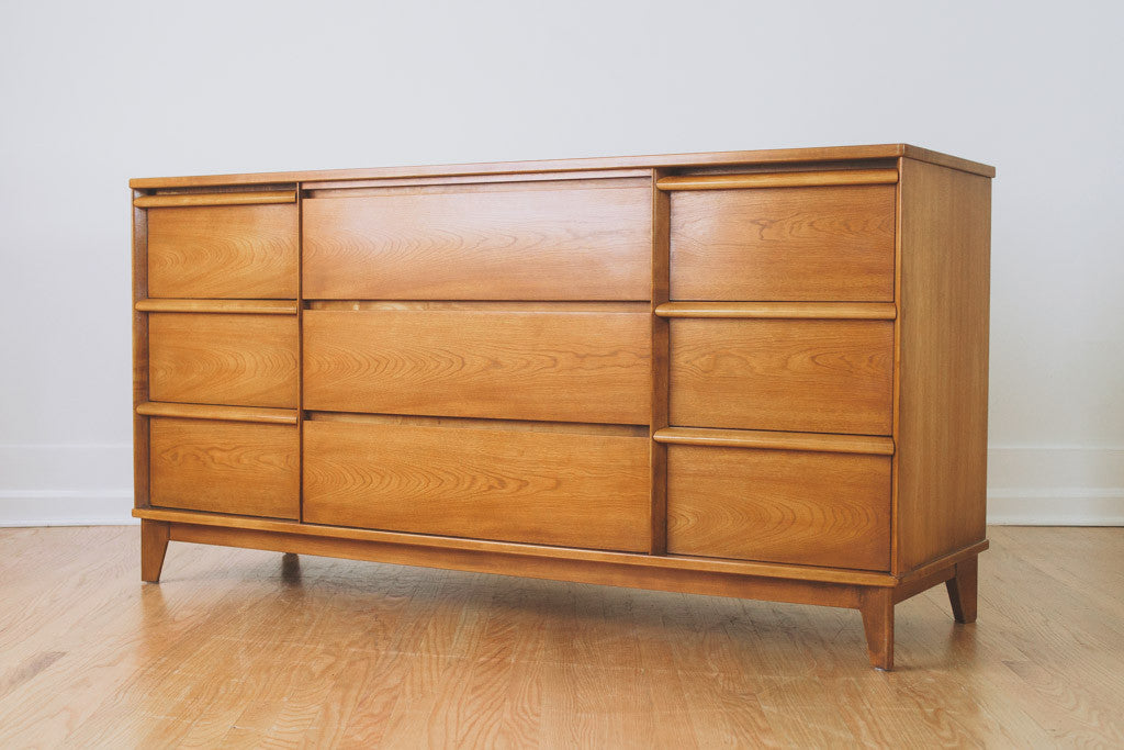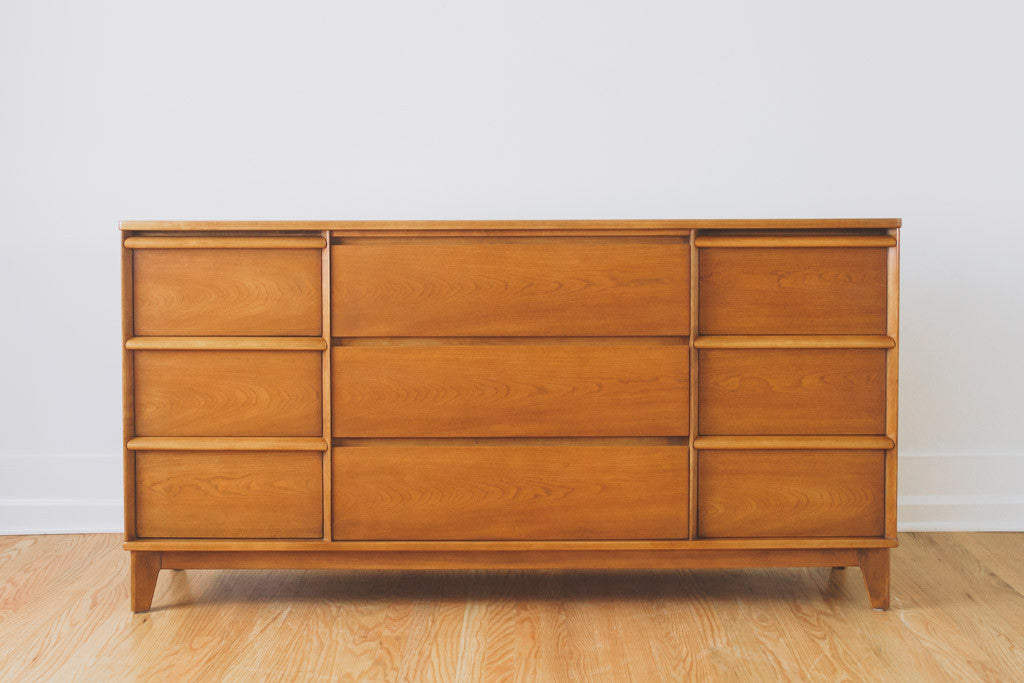 This Mid Century nine drawer lowboy dresser is solid wood with recessed pulls and tapered legs. It's in great shape with age related wear. It could also be used as a credenza, sideboard or buffet. See pictures for detailed condition.