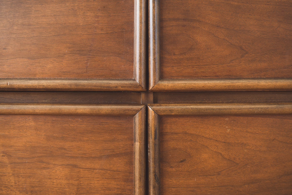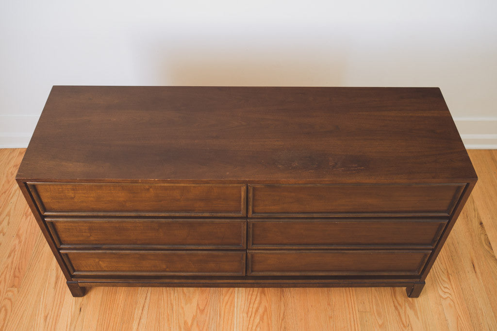 This Mid Century six drawer lowboy dresser was manufactured by BP John. It's dark walnut with a wood top and is in good shape with age related wear. It could also be used as a sideboard, buffet or credenza. See pictures for detailed condition.