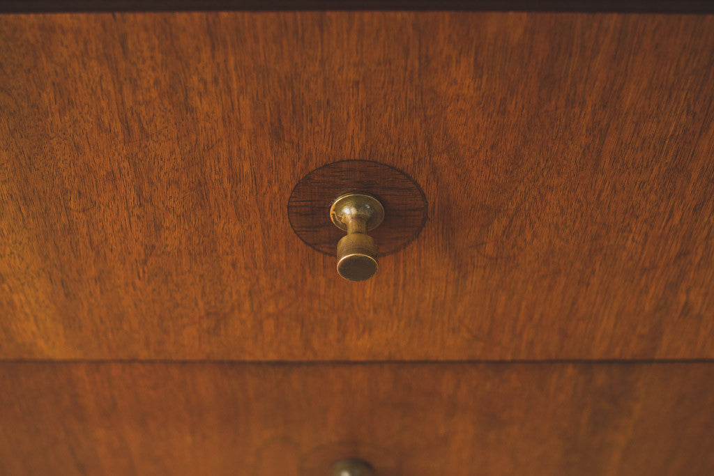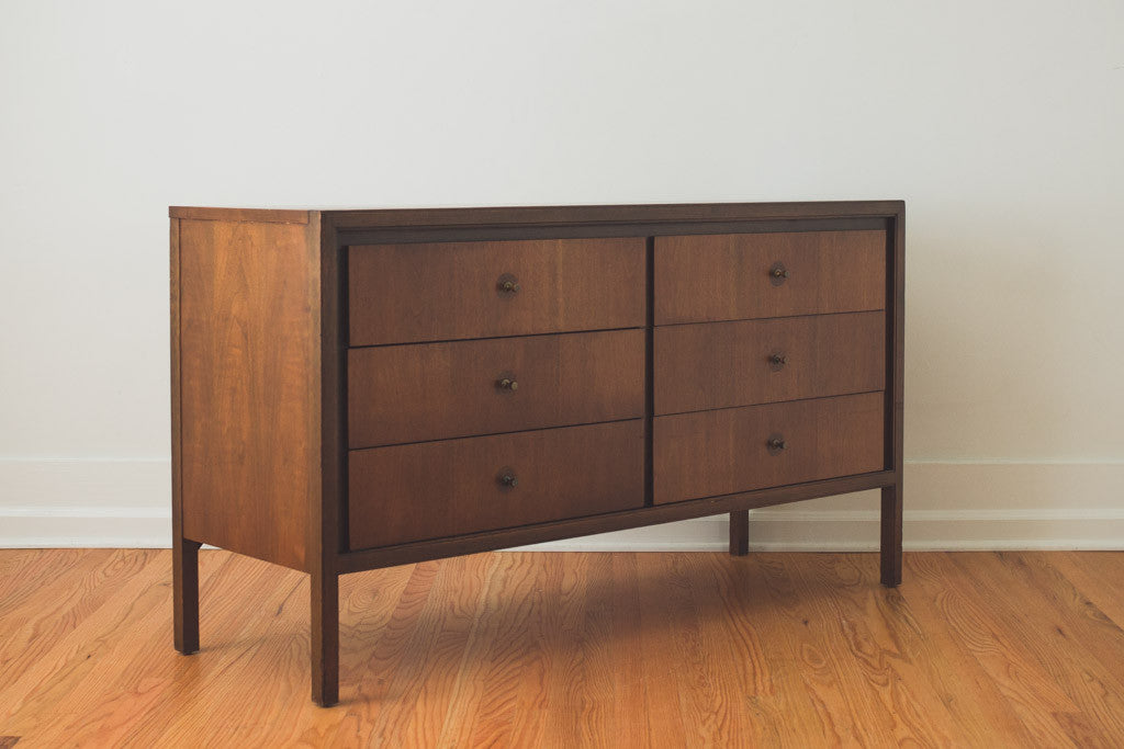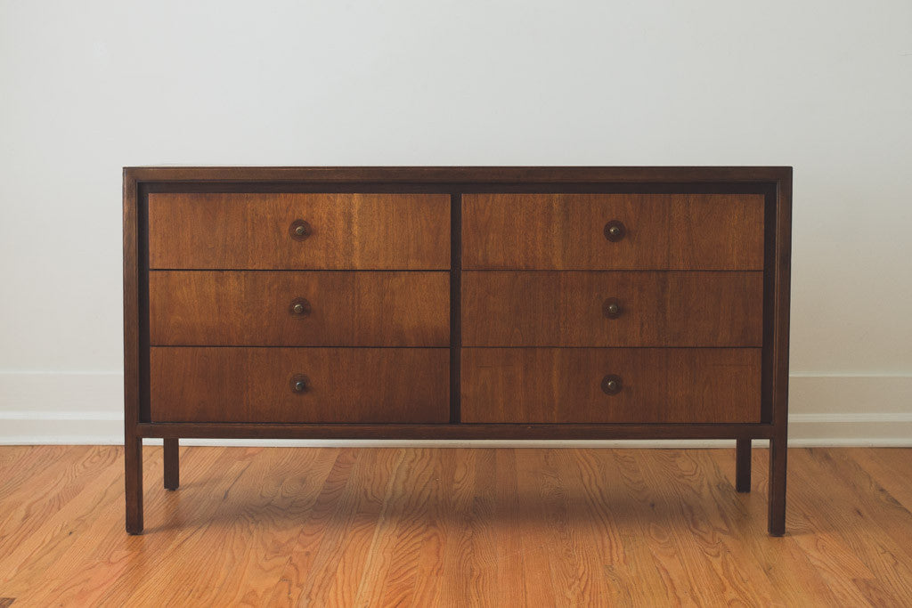 This Mid Century six drawer lowboy dresser was manufactured by Basic Witz. It's dark walnut with brass pulls and a wood top. It's in good shape with age related wear. It could also be used as a sideboard, buffet or credenza. See pictures for detailed condition.
