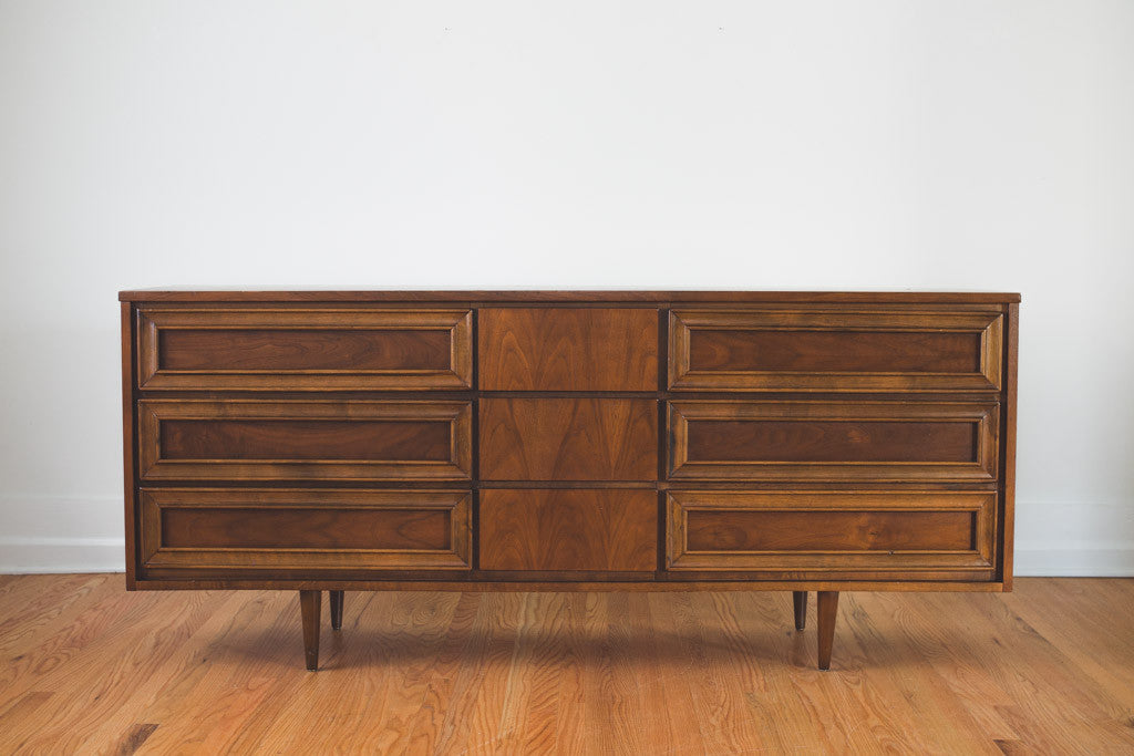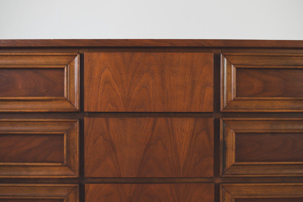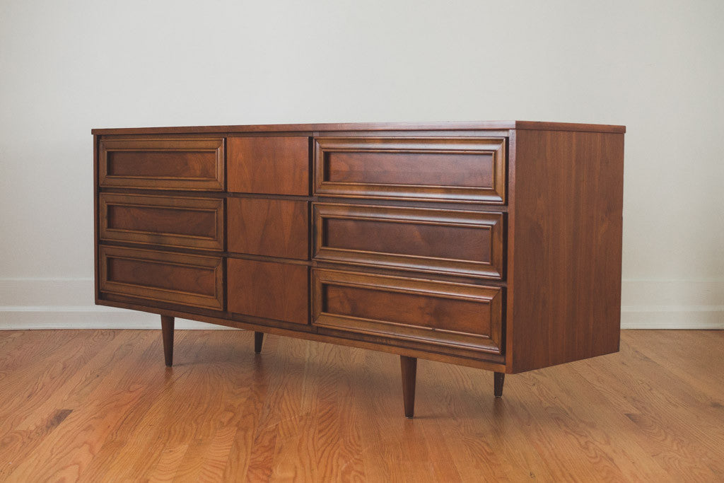 This Mid Century nine drawer lowboy dresser is dark walnut with recessed pulls and a wood top. It's in good shape with age related wear. It could also be used as a sideboard, buffet or credenza. See pictures for detailed condition.