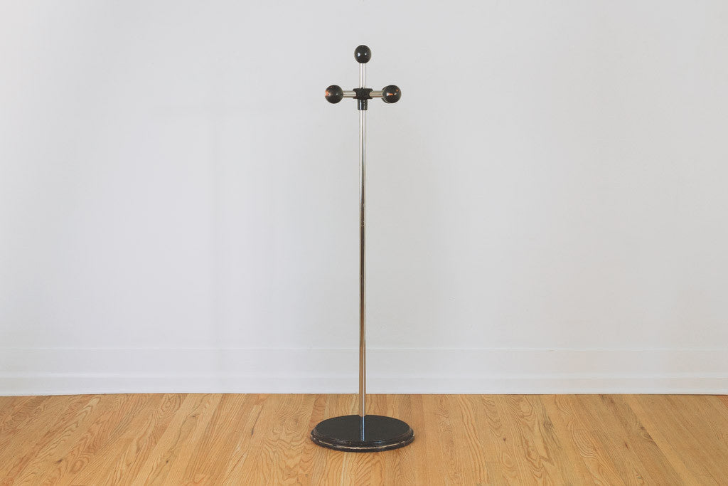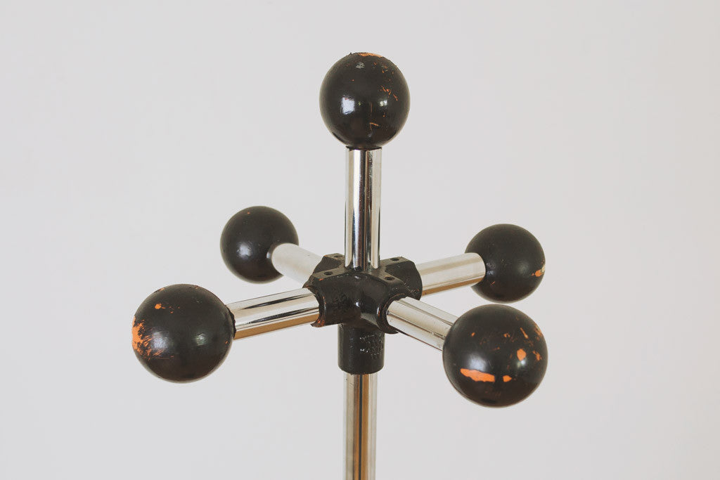 This vintage metal coat rack has four distressed black painted knobs and a spot to set your hat. It would be great in an entryway, mudroom or used as a towel rack in a bathroom. It's in good shape with age related wear. See pictures for detailed condition.