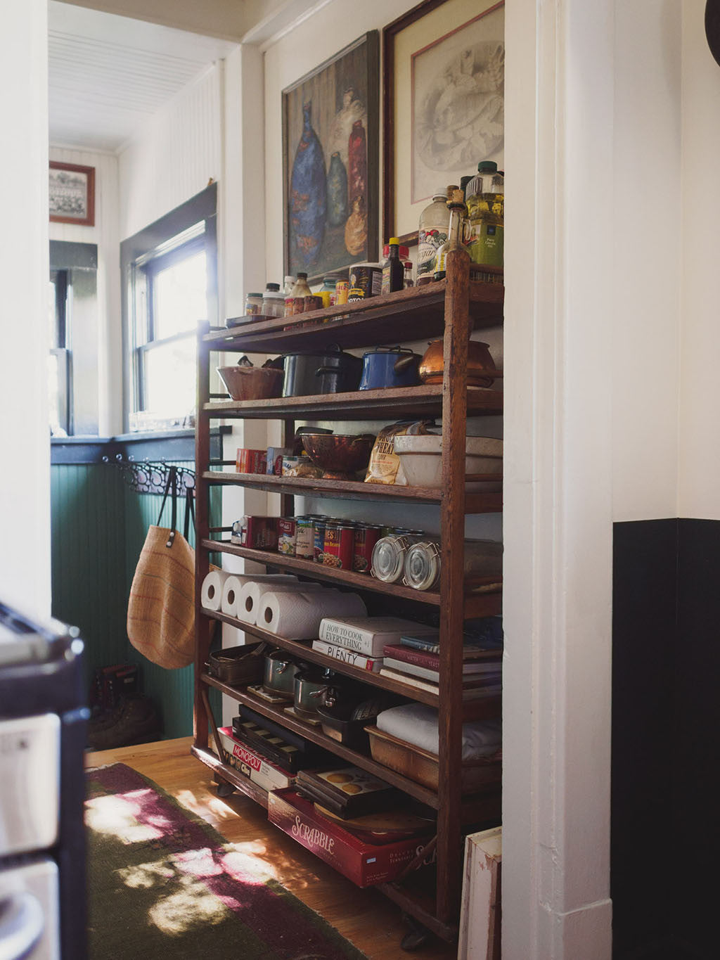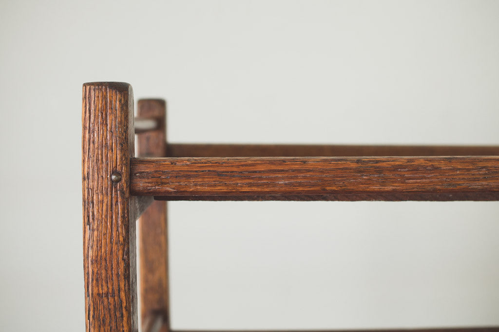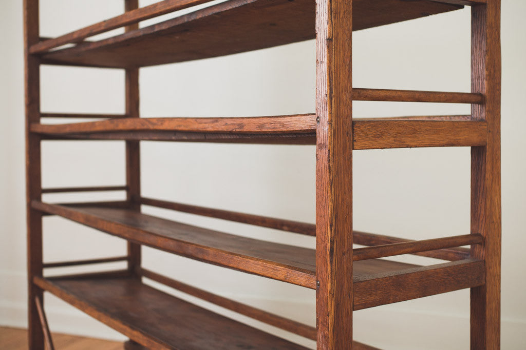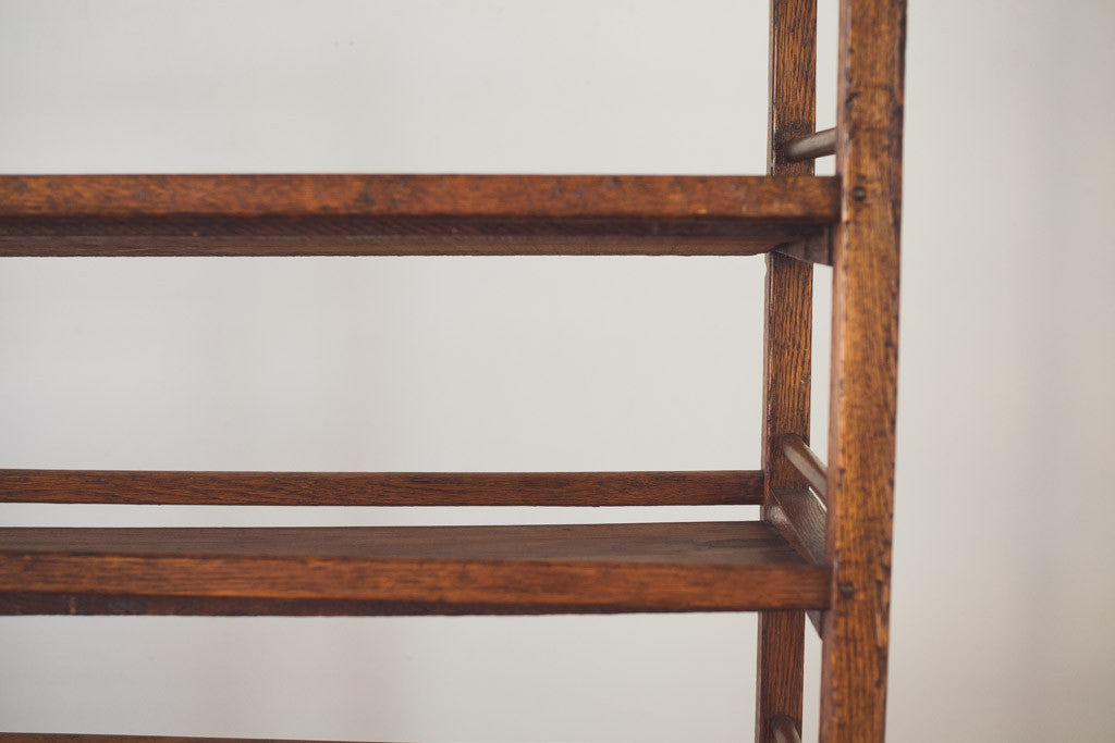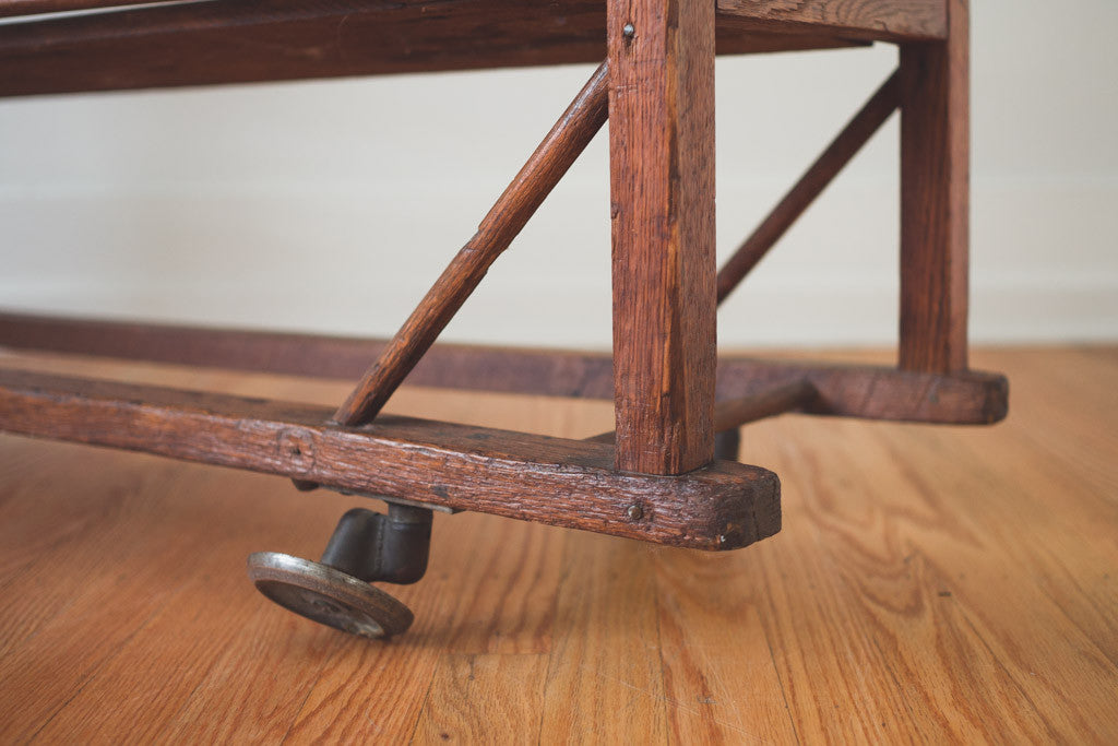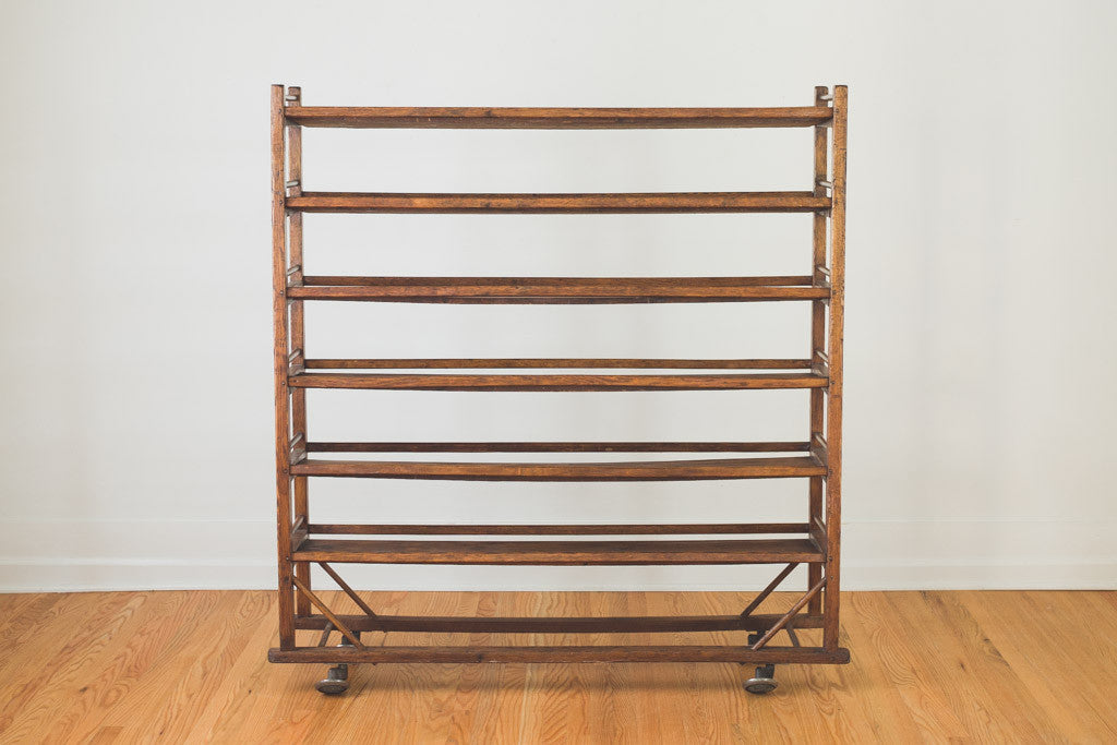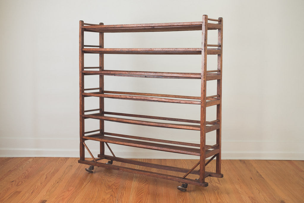 This antique bread cooling rack has six long shelves and a lower section for trays. It has a natural oak finish with metal accents and wheels. It could be used as a pantry or to store clothes, shoes or books. Heavy items would be best stored on the sides, the shelves will bow in the middle if supporting too much weight. It's in great shape with age related wear. See pictures for detailed condition.
