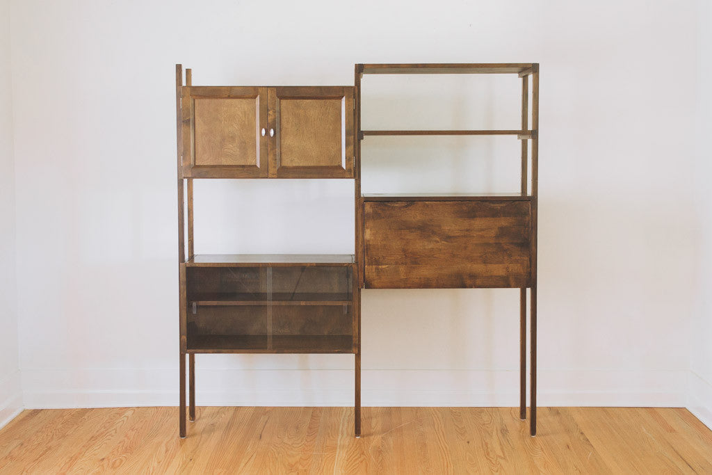 This Mid Century modular double shelving unit was manufactured by Kopenhavn. It comes with a six piece frame, two shelves and three cabinets. The cabinets include one with reversible door faces, one with sliding glass doors and one that folds down into a desk with drawer. This unit can be rearranged to suit your specific needs. It's in good overall shape with age related finish wear. See pictures for detailed condition.