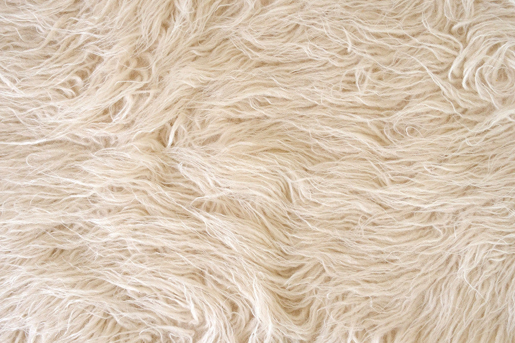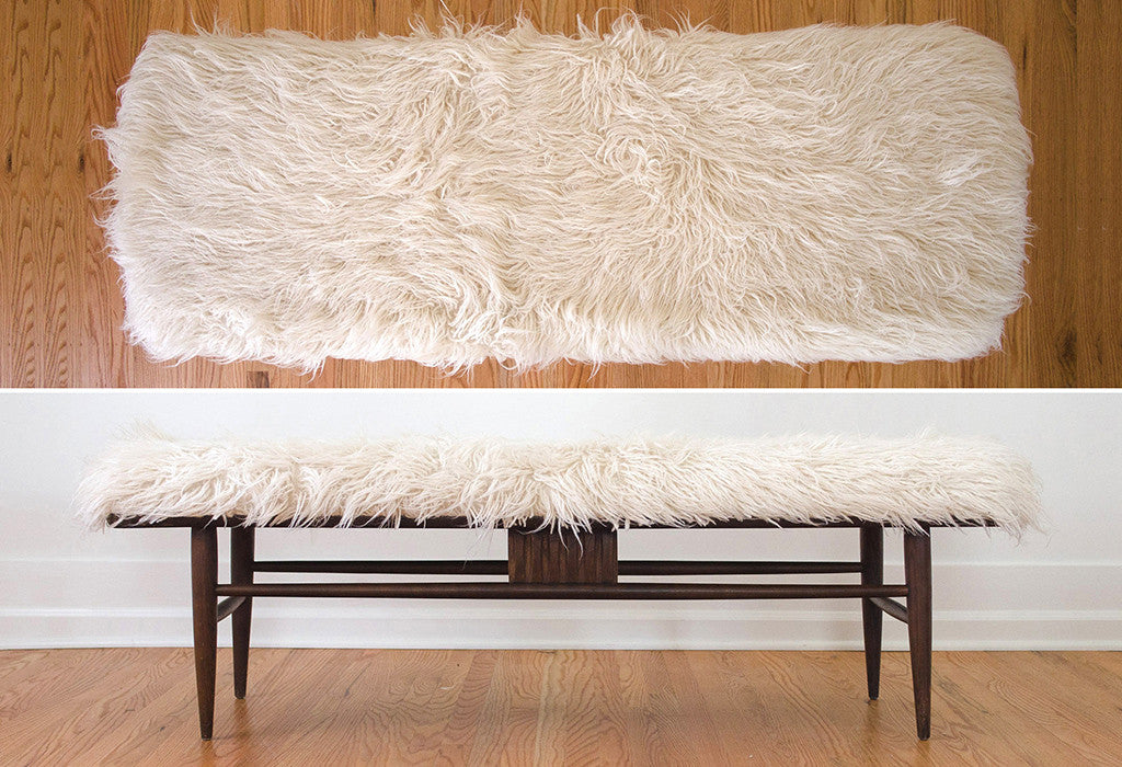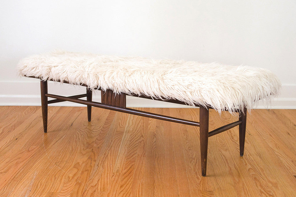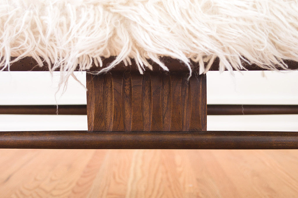 This is the second bench in our HS Collection natural wool series. It has a dark walnut base, topped with new foam and upholstered in a vintage wool sheepskin fabric. The upholstery is similar in pile to a Flokati rug. This bench has a large seating surface, is extremely comfortable and is in excellent shape with some light character wear on the frame. Please see pictures for detailed condition of this piece.
