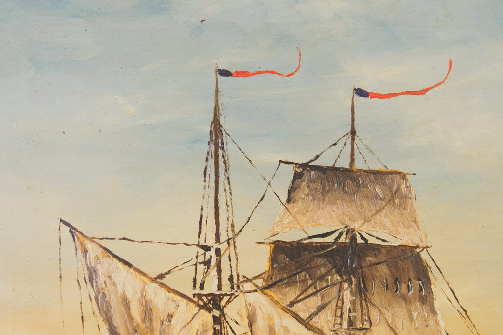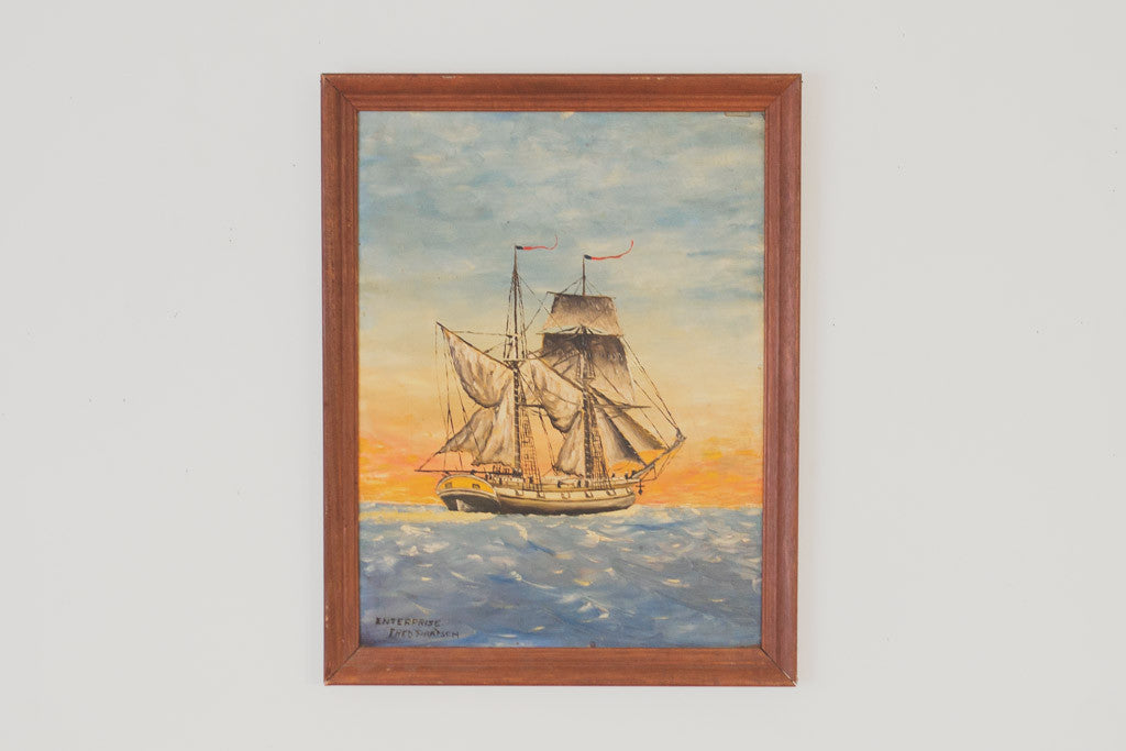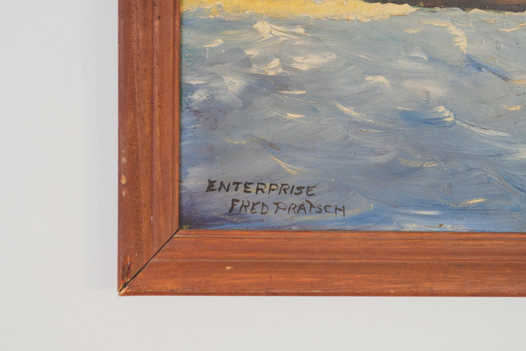 This original framed Mid Century oil painting is nautical themed and signed, "Enterprise, Fred Pratsch". The colors are vibrant blues and oranges with red, white and tan accents. It's in good shape with natural age related wear. Please see pictures for detailed condition.