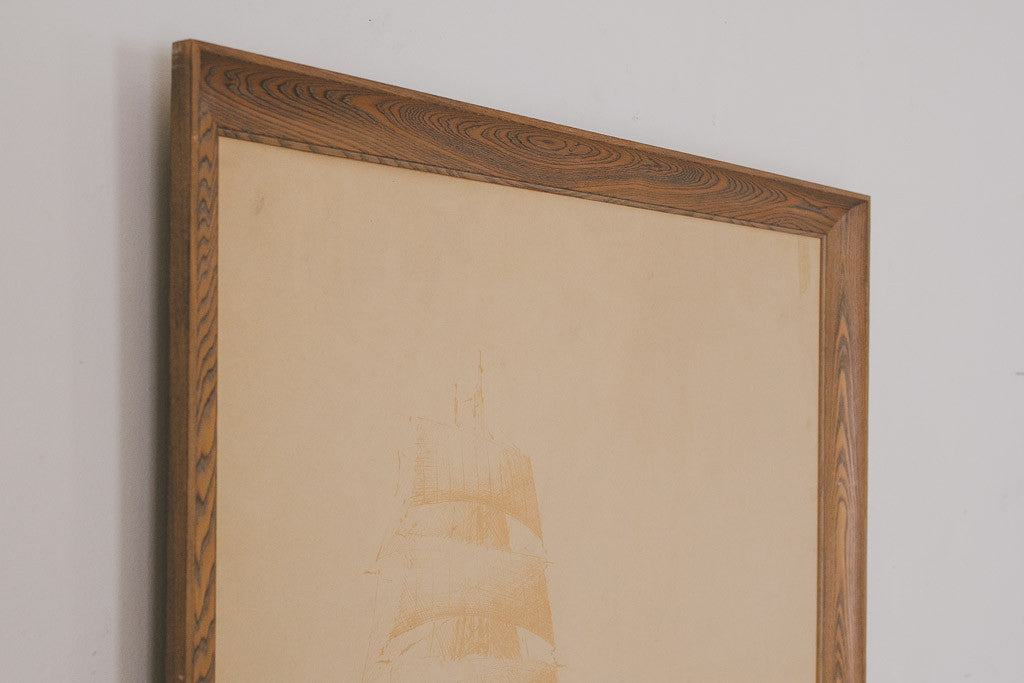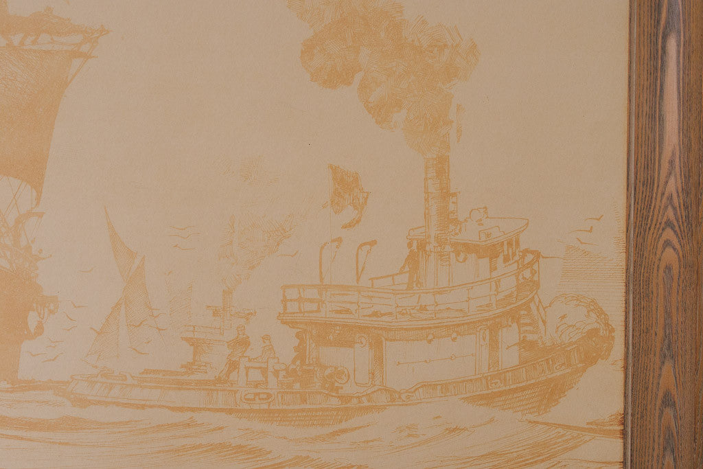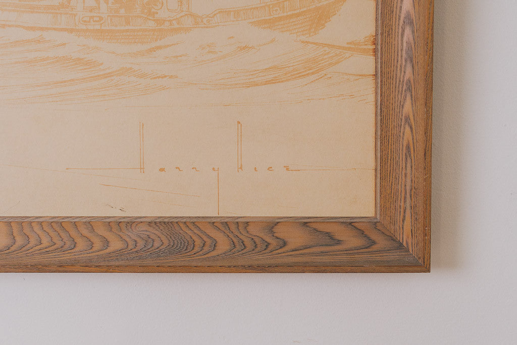 This huge framed Mid Century print is signed "Harry Rice". It features a nautical scene of steamships and a large sailboat at sea. It's in great overall shape with some light age related wear. Please see pictures for detailed condition of this piece.