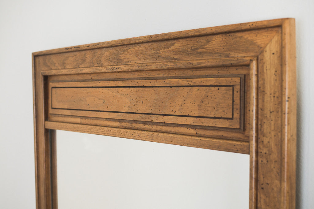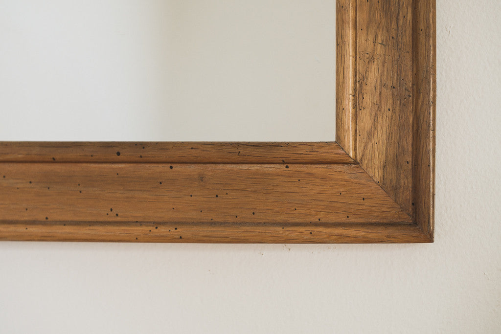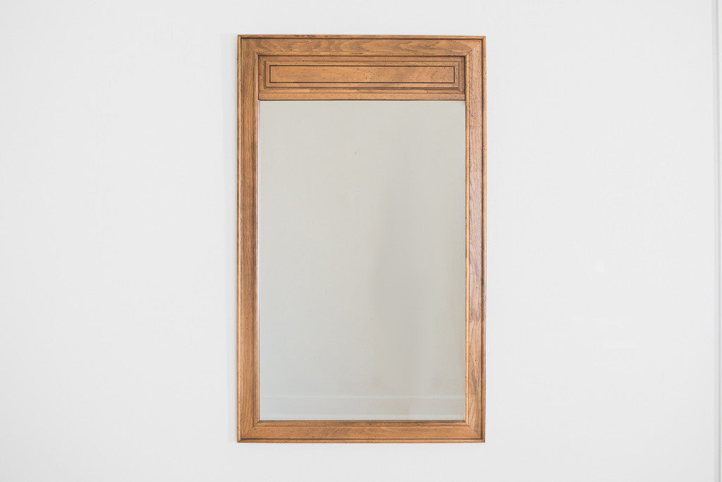 This vintage Mid Century era mirror has a carved oak frame. It's in good shape and would be a nice addition over a bathroom vanity, dresser or in an entryway. See pictures for detailed condition.