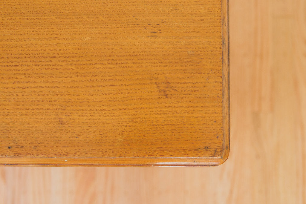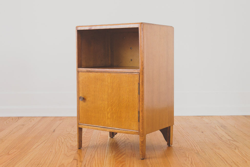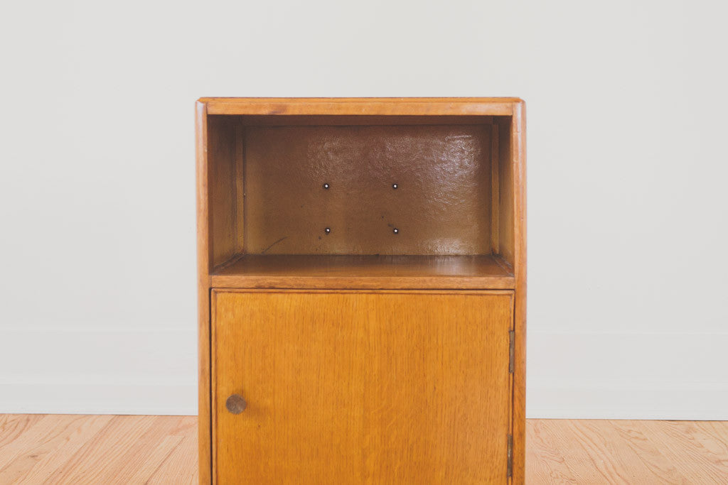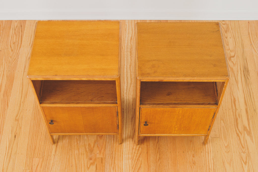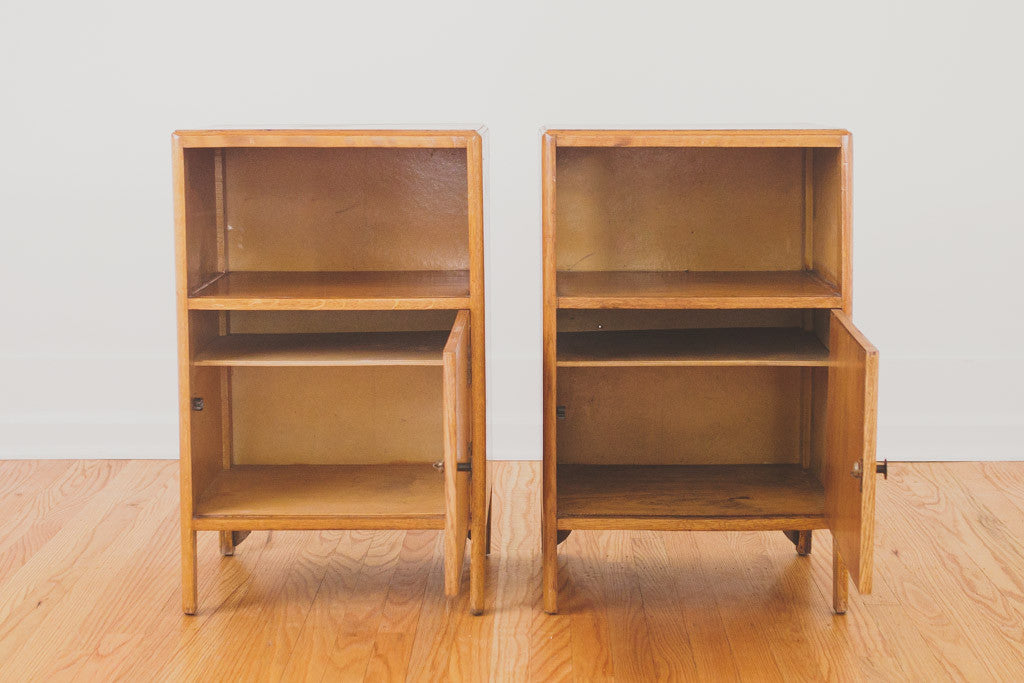 This pair of Mid Century oak nightstands have solid wood tops, metal pulls, a single drawer, shelf and open storage behind a swinging door. They're in good shape with some age related wear. Please see pictures for detailed condition.