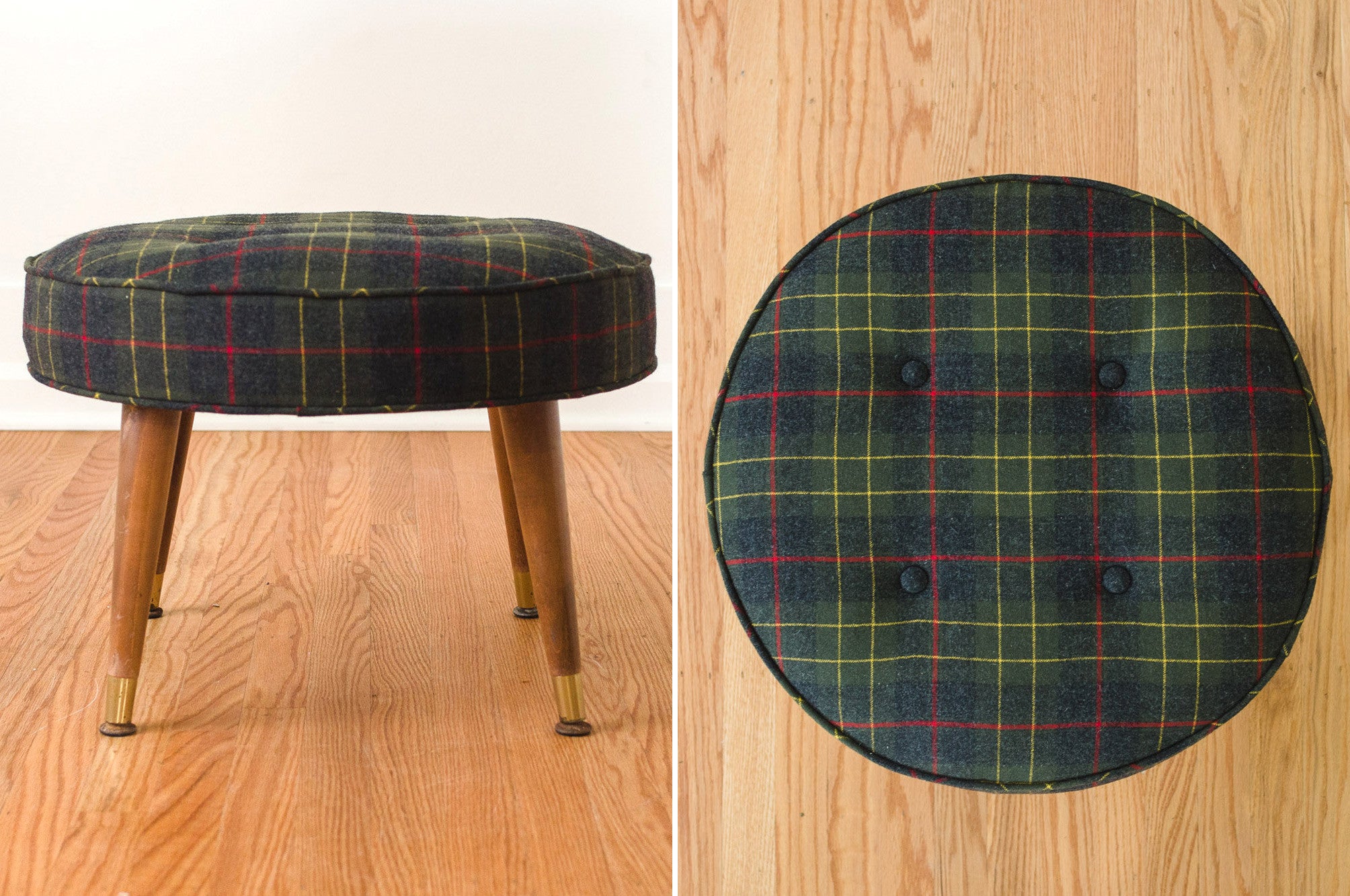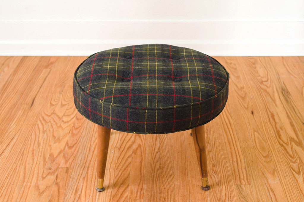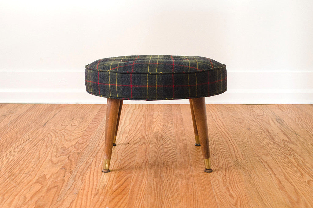 We had this vintage ottoman reupholstered in a tartan plaid wool fabric. This plaid is awesome, it has a dark gray base with green, yellow and red accents. The legs on this piece are teak with brass-capped feet. It's in overall excellent shape with some age related wear to the legs. It would also be a great stool. Please see pictures for detailed condition of this piece.