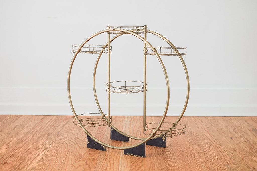 This Mid Century plant stand has a distressed gold metal frame with six circular shelves. It's in good shape with age related patina and wear. See pictures for detailed condition.