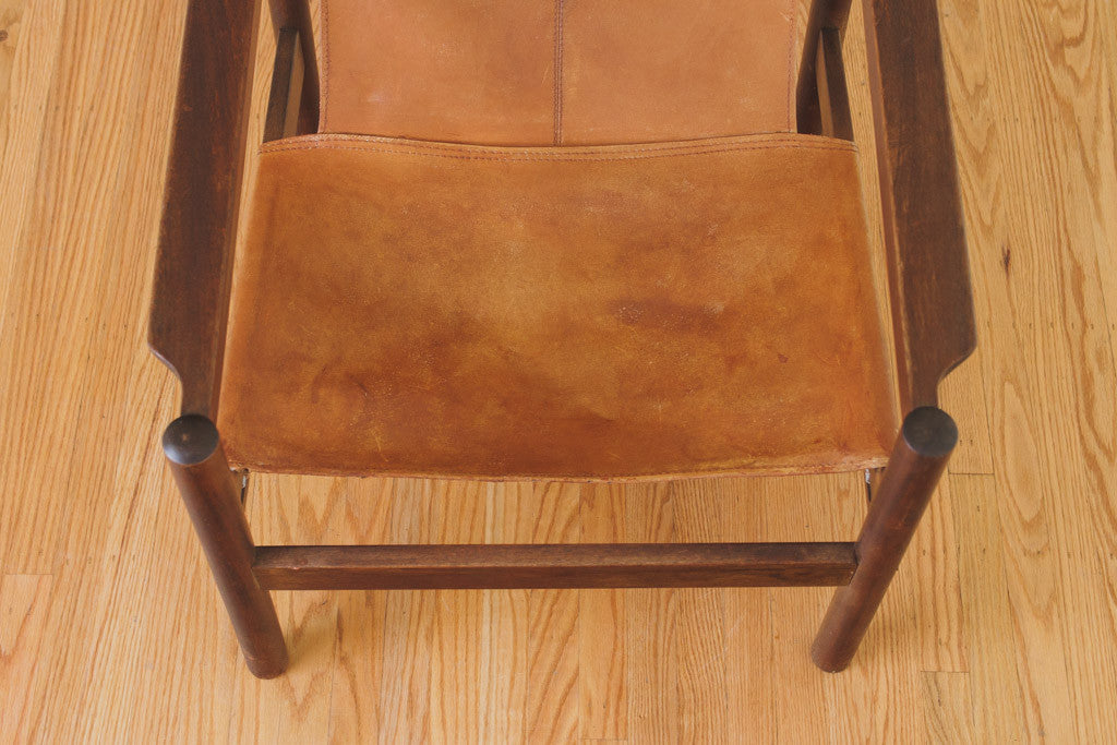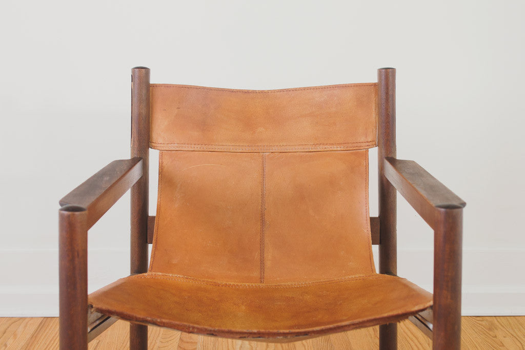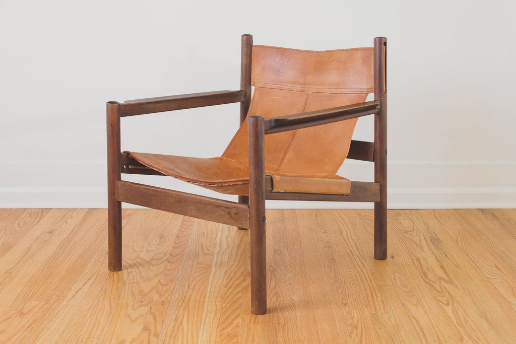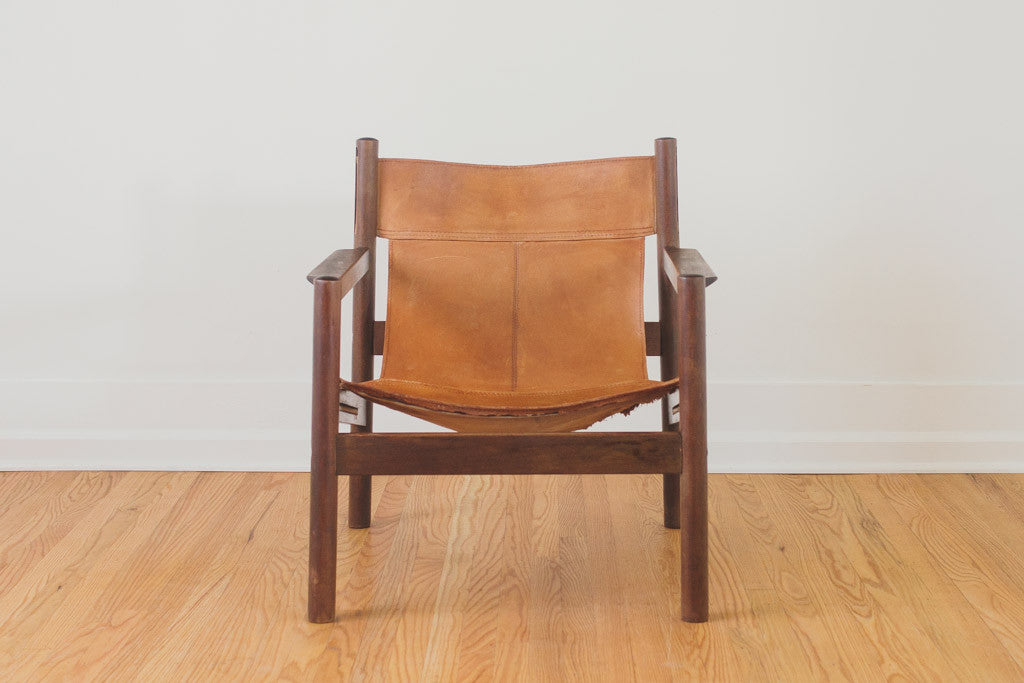 This pair of Mid Century leather Roxinho Sling Chairs chairs were manufactured in Argentina by Michel Arnoult. They have thick distressed leather upholstery and sturdy wood frames. They're in good condition with age related wear. Please see pictures for detailed condition.