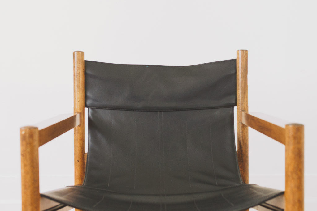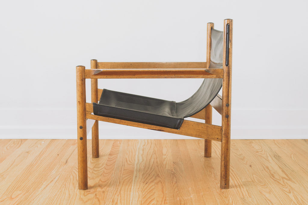 This Mid Century sling chair was designed by Michel Arnoult. It has thick black naugahyde upholstery and a sturdy wood frame. It's in great shape with age related wear. See pictures for detailed condition.