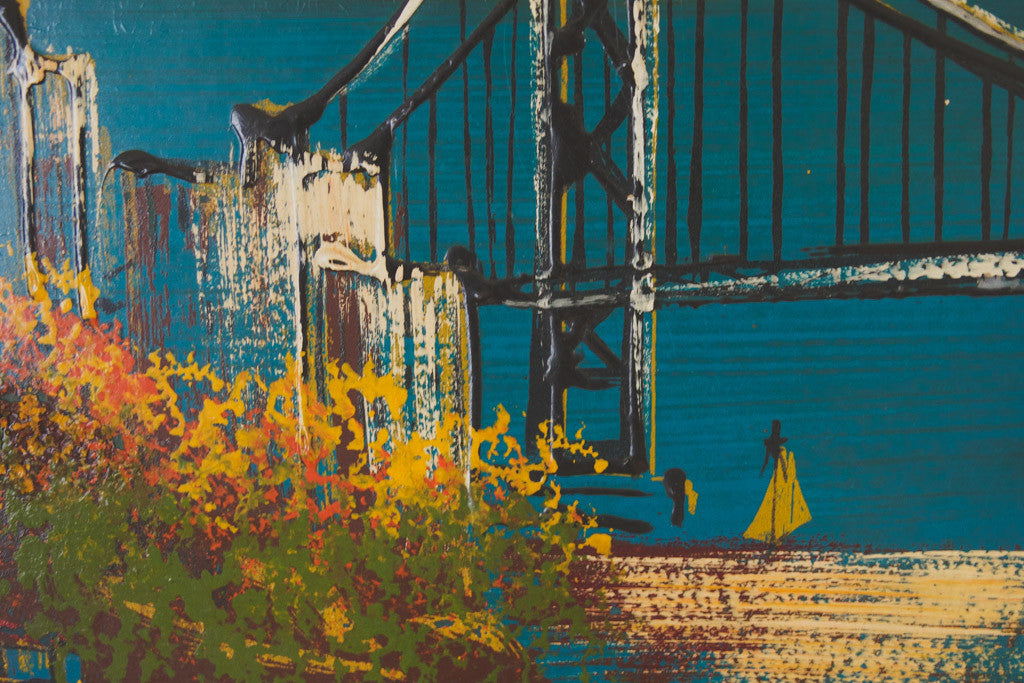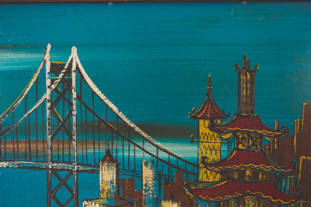 This vintage large framed original oil painting shows the city of San Francisco in vibrant blues, oranges, yellows, greens and reds. It's in good shape with age related wear to the frame. Please see pictures for detailed condition.