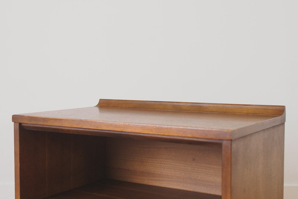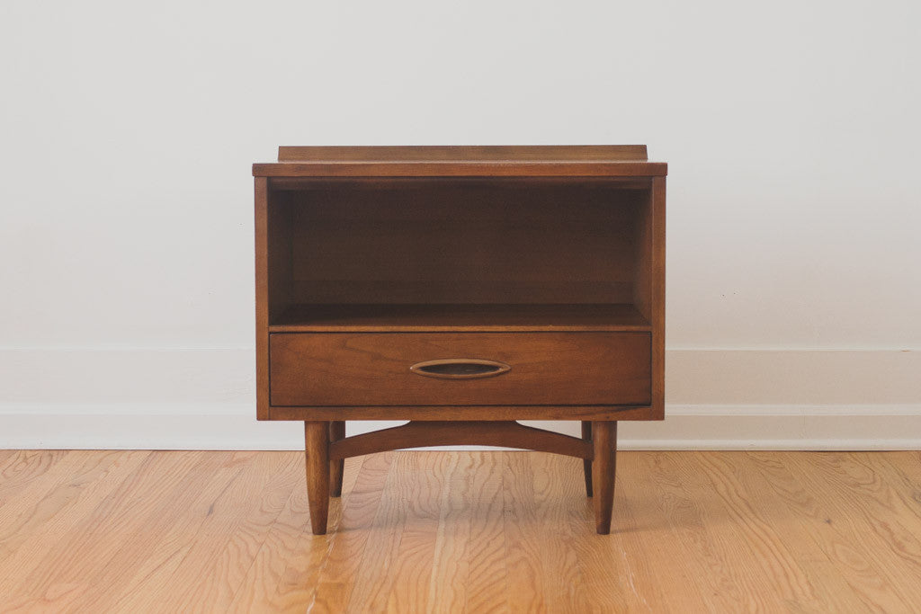 This Mid Century Broyhill nightstand is part of the Sculptra line. It's walnut with a wood top, carved wood drawer pull, single drawer and open storage. This piece is in good shape with light age related wear and could also be used as a side table. Please see pictures for detailed condition.