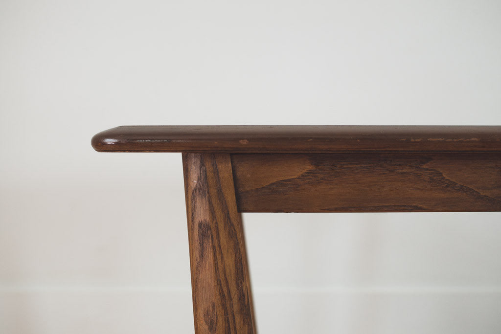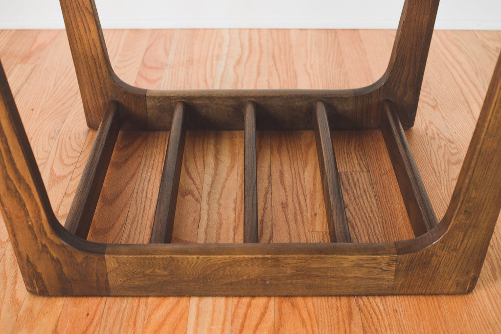 This walnut Mid Century side table has a wood top with open shelving below. It's in good shape with age related wear. See pictures for detailed condition.