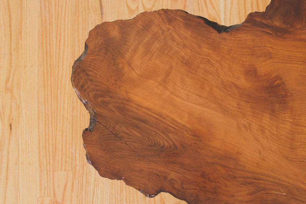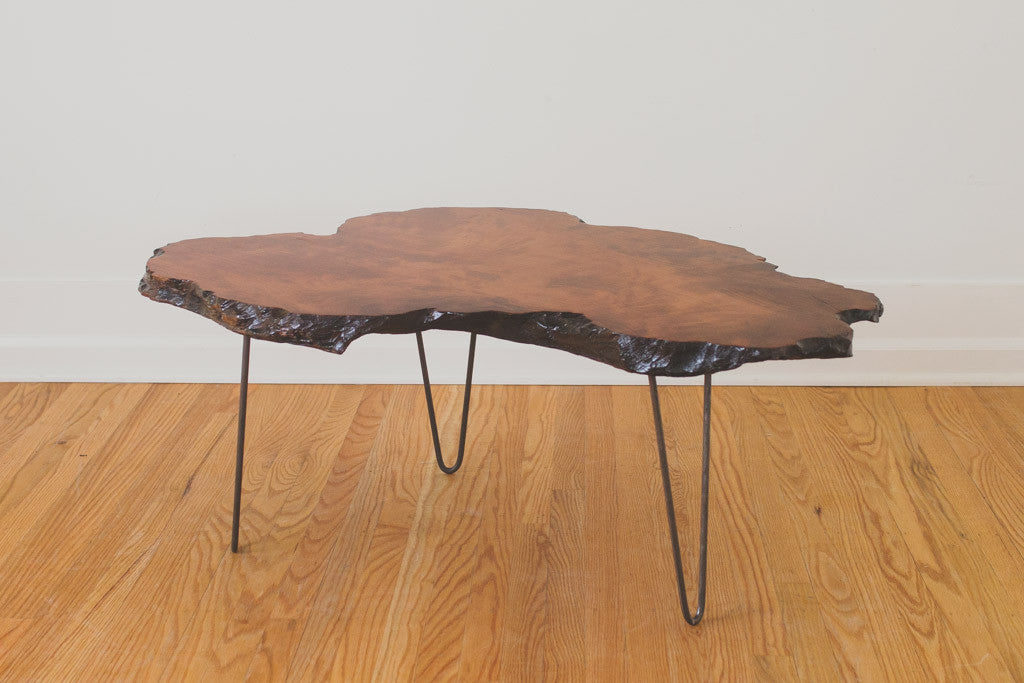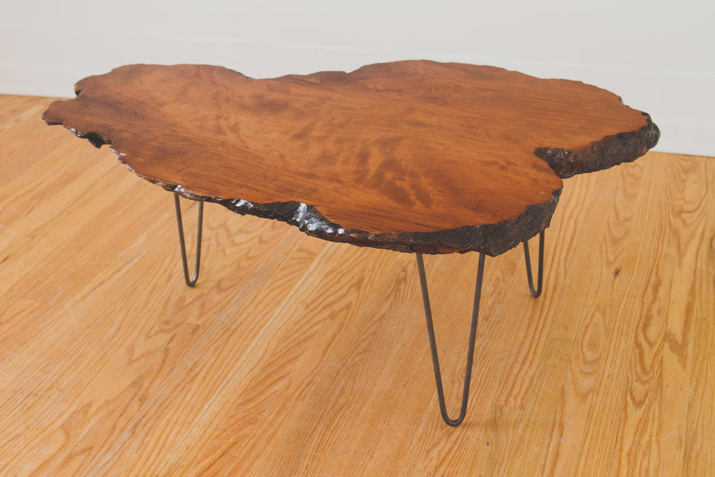 This Mid Century live edge, wood slab coffee table has a lacquered finish and metal hairpin legs. It's in excellent shape with some light age related wear. Please see pictures for detailed condition.
