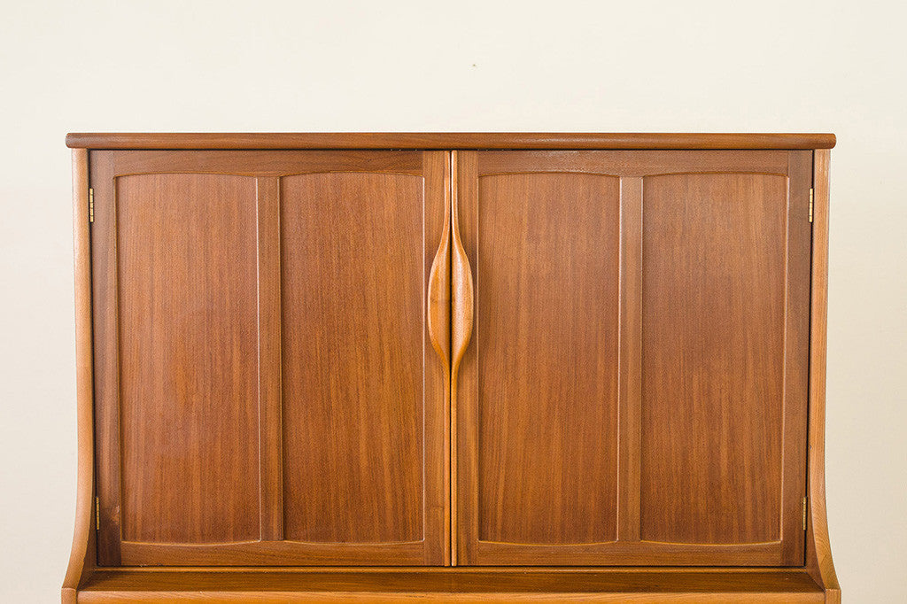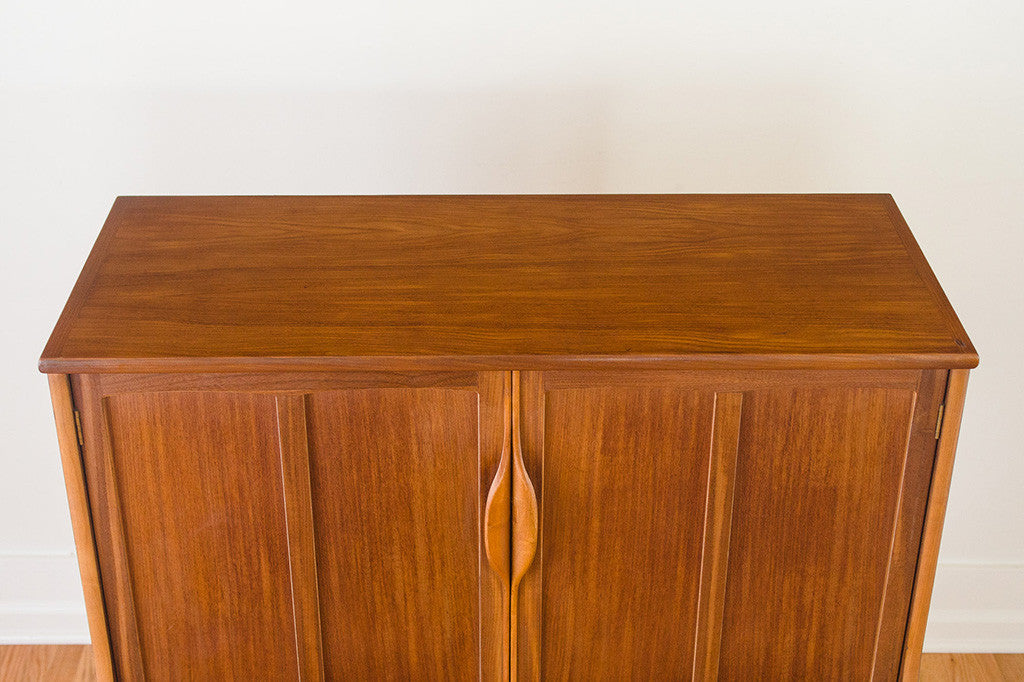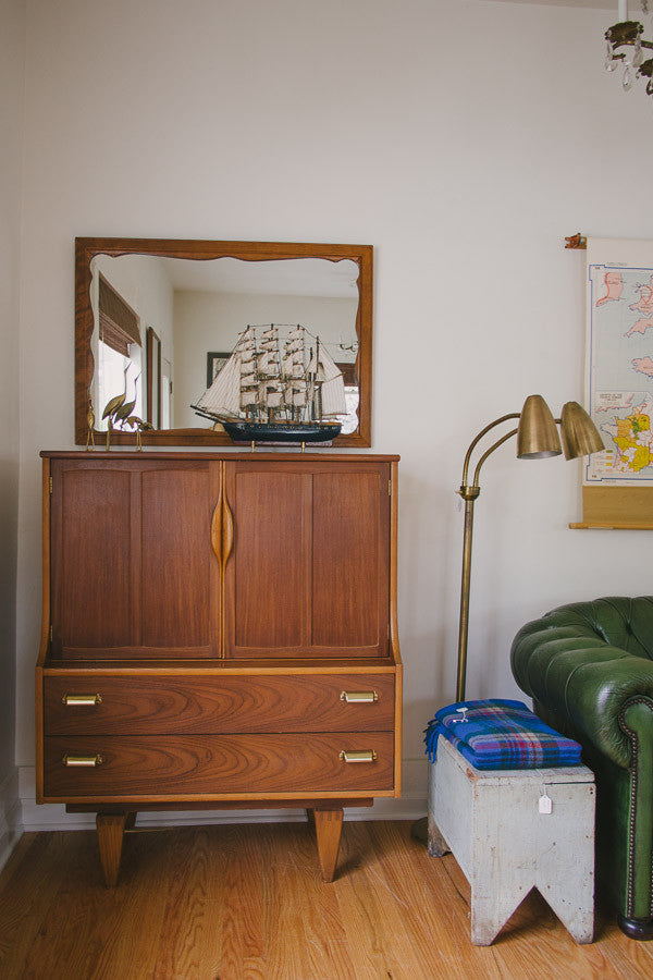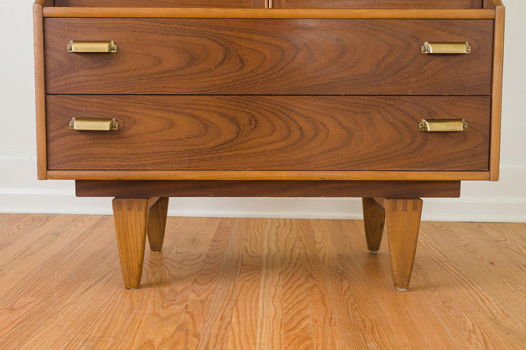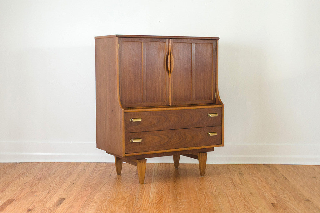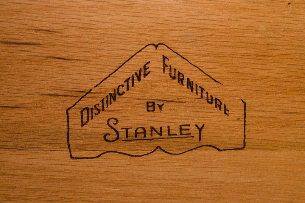 This vintage Mid Century walnut dresser was manufactured by Stanley Furniture. It's a five drawer highboy style with a generous amount of storage space. It has two doors that open to reveal three drawers and two lower, larger drawers with brass handles. This piece has a solid wood top and is in overall excellent condition with some light age related wear. Please see pictures for detailed condition of this piece.