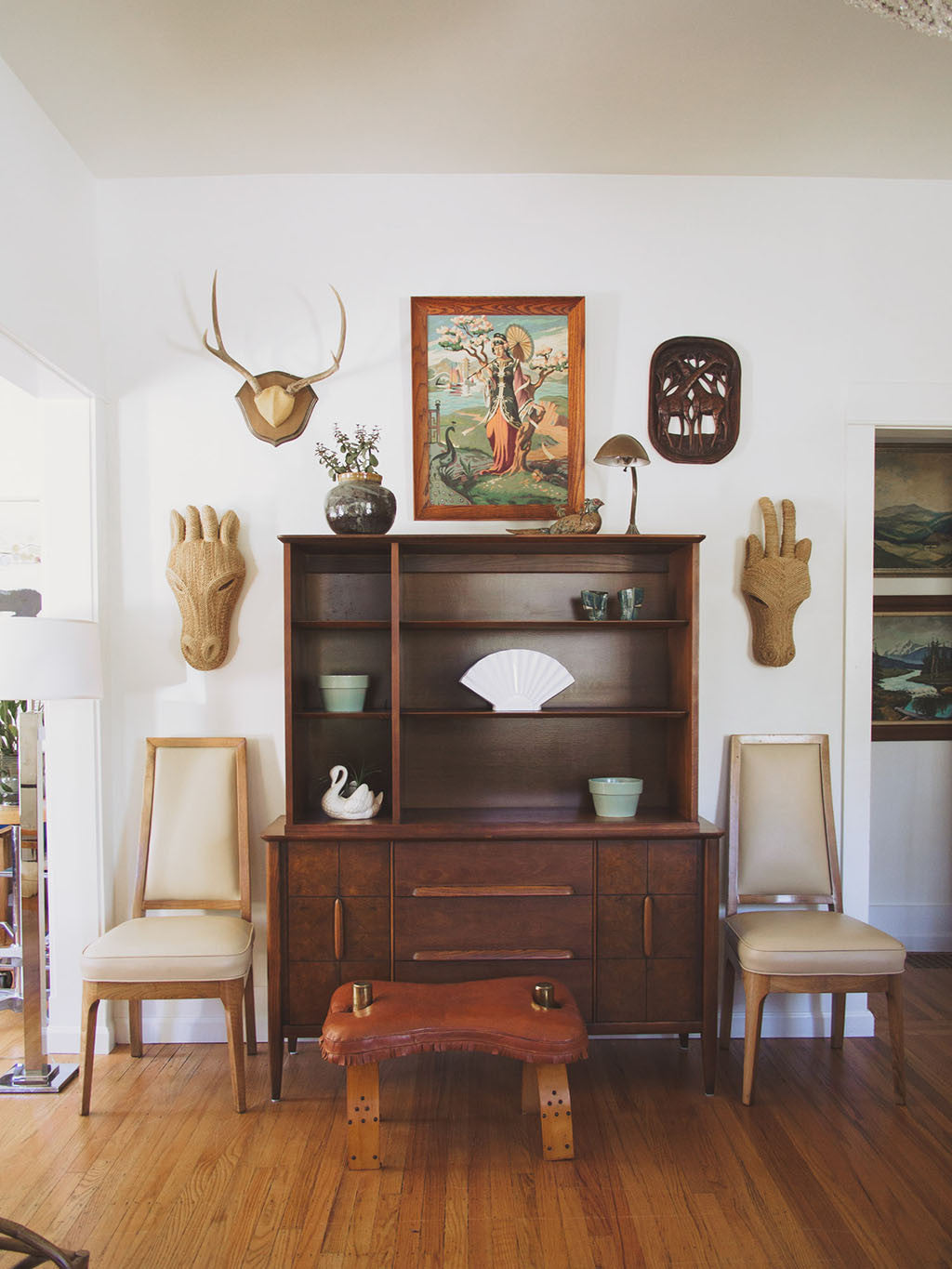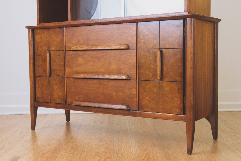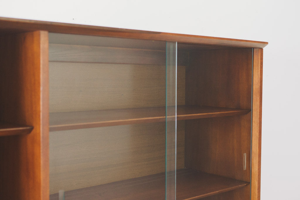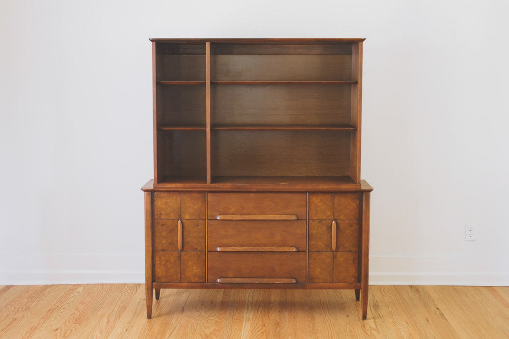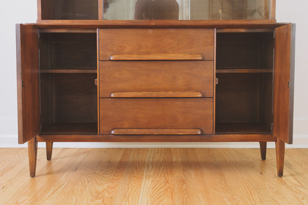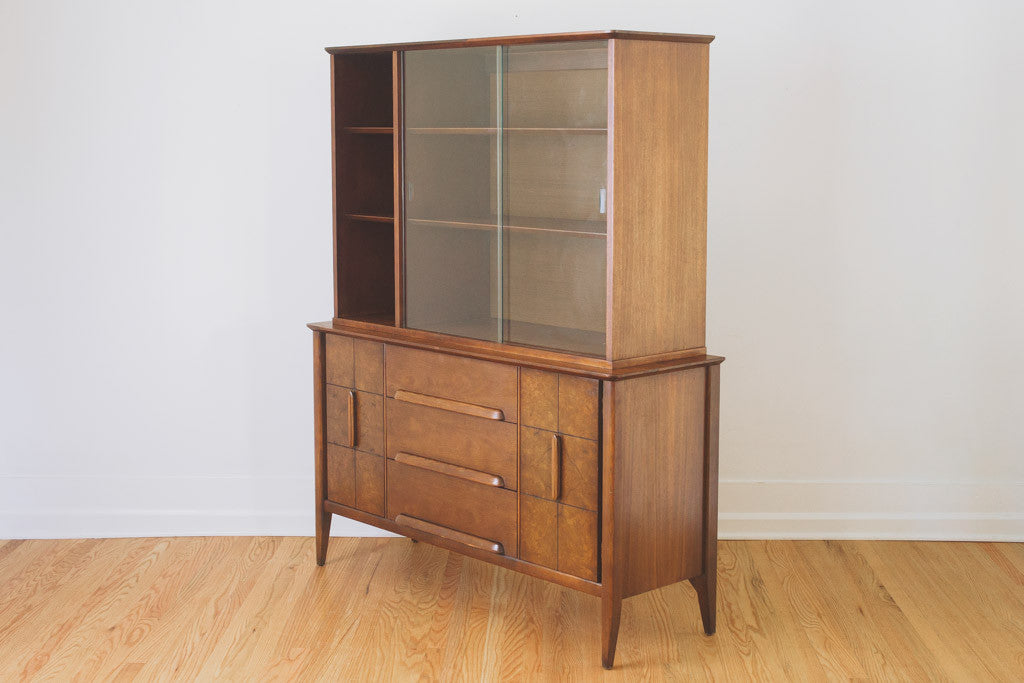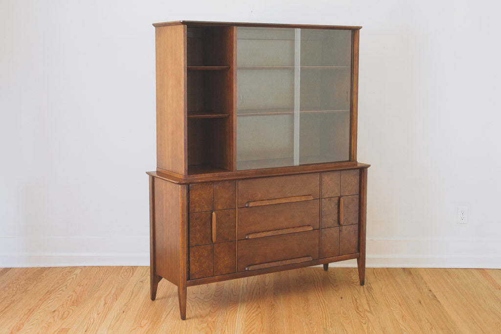 This Mid Century walnut hutch was manufactured by Stanley. It has three drawers, two lower cabinets, three shelves behind sliding glass doors and carved wood pulls. It's in good shape with age related wear. See pictures for detailed condition.
