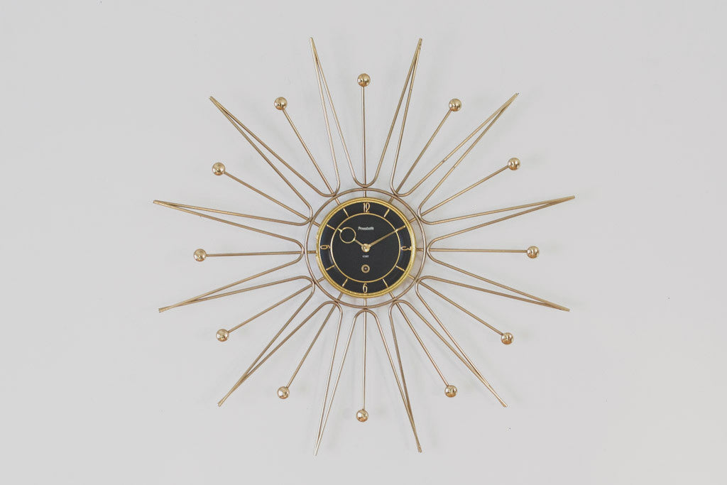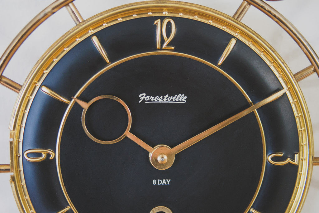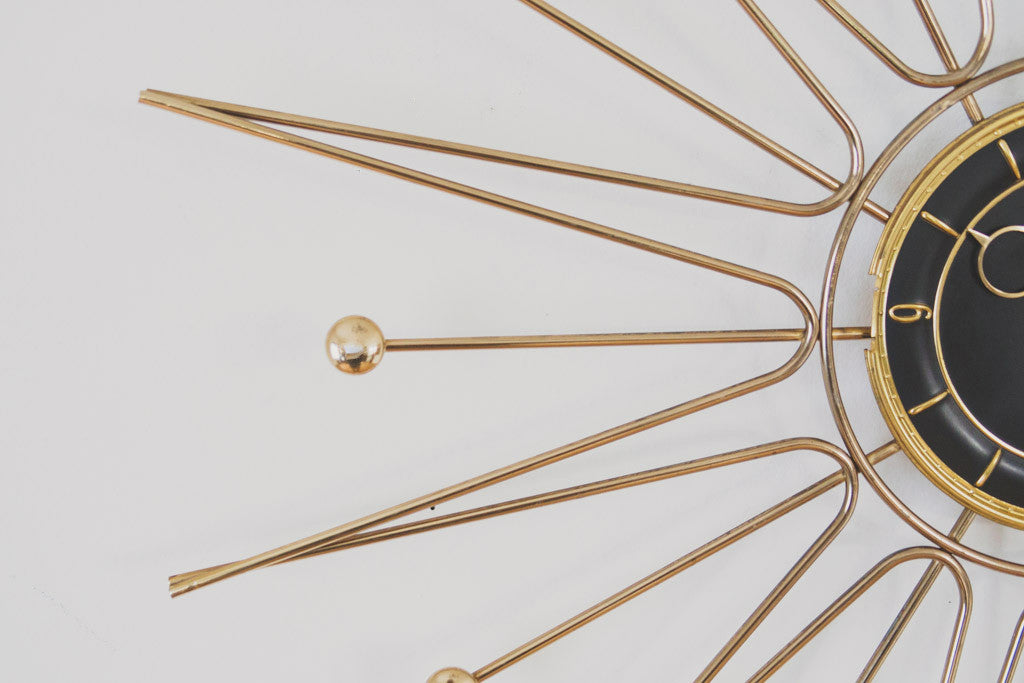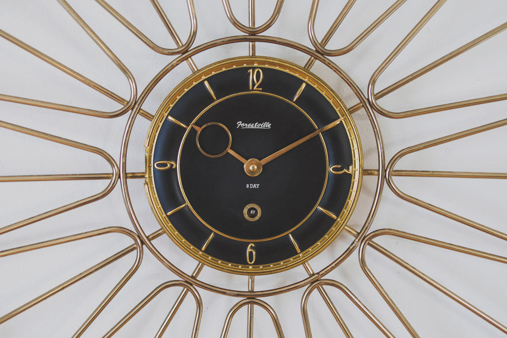 This Mid Century brass wall clock is made by Forestville. It has sunburst arms that extend from the center and comes with a windup key to keep it running. It's in good shape with some age related wear. Please see pictures for detailed condition.