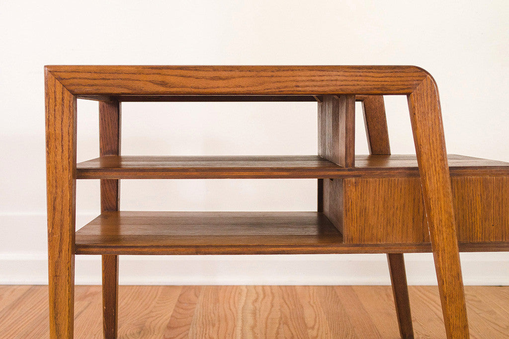 This vintage Mid Century side table has four levels for storage and one drawer. It has a solid wood top and is in overall excellent condition with some light age related wear. Please see pictures for detailed condition of this piece.