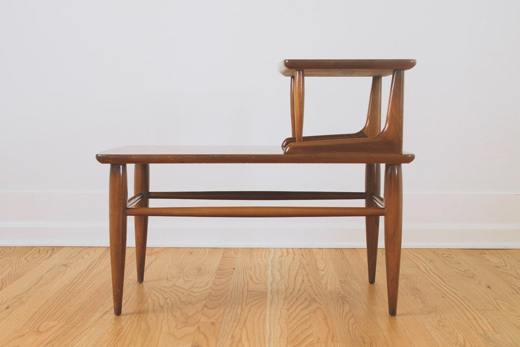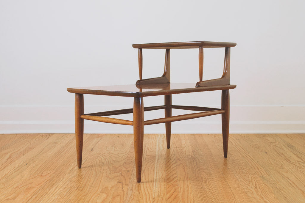 This vintage Mid Century step side table was manufactured by Mersman. It's walnut with two shelves and is in good shape with age related wear. See pictures for detailed condition.