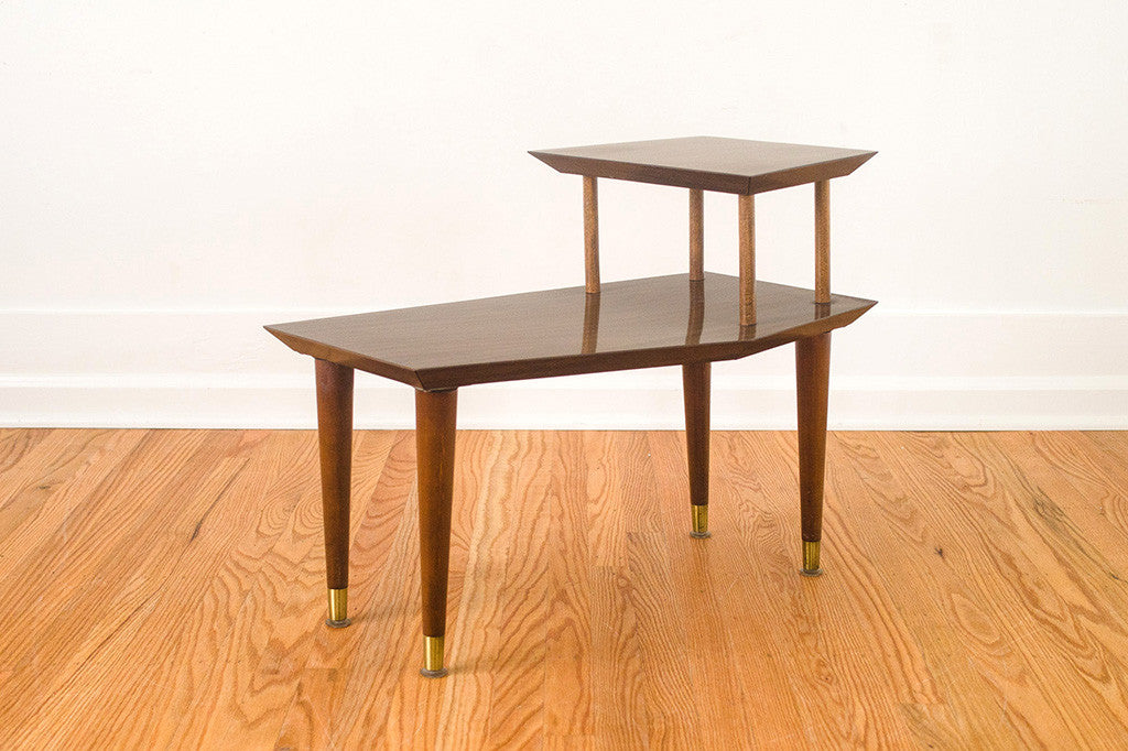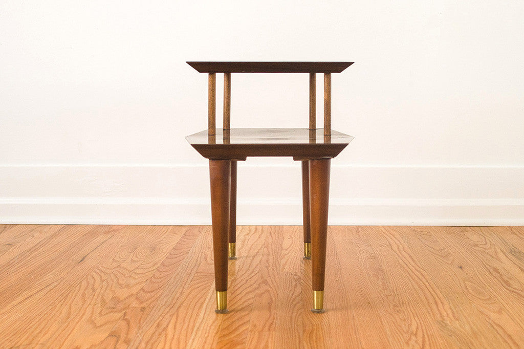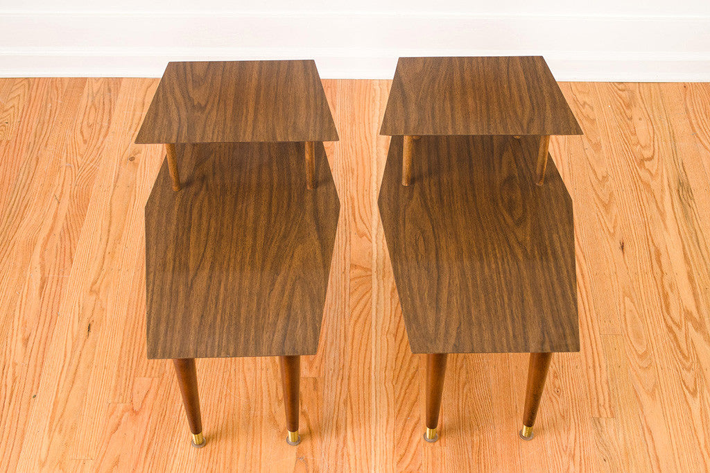 This classic set of Mid Century side tables are in excellent shape. They're dark walnut, with a solid surface top. Perfect for casual homes that don't want to fuss with coasters or homes with children. Put them on either side of your sofa or use them as bedside tables paired with a lower bed frame. The legs can be positioned straight or at an angle for a more retro look. They're in good condition with some light age related wear. Please see pictures for detailed condition of these pieces.