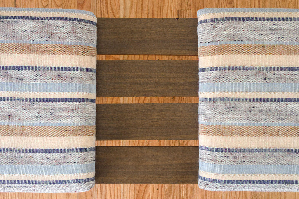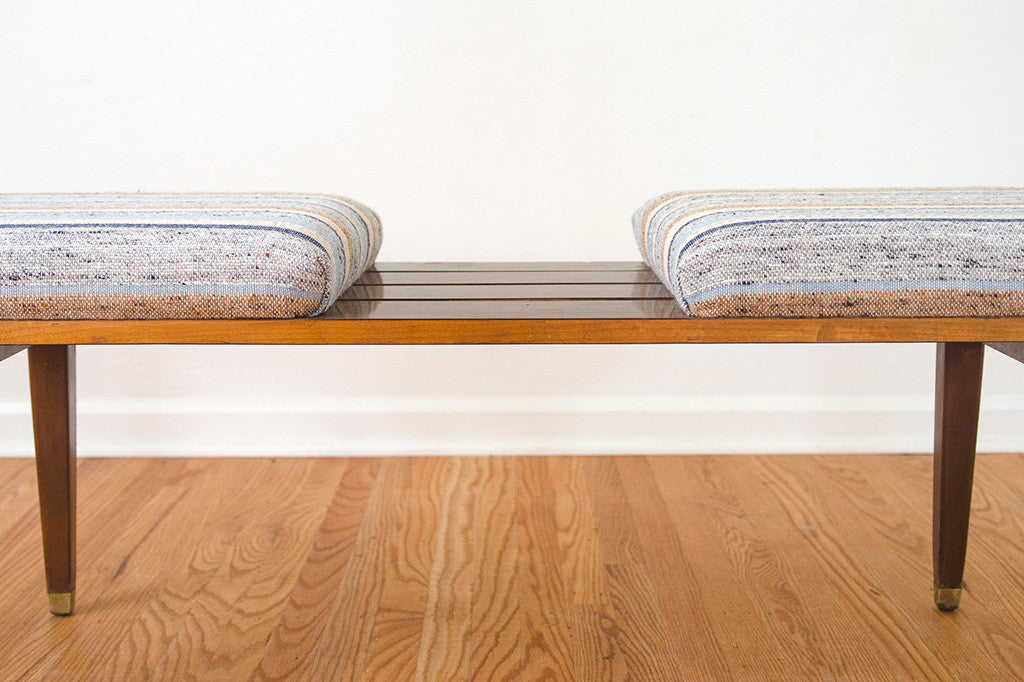 We had this dark wood Mid Century slat bench reupholstered in a vintage blue, cream and brown nubby fabric. This handsome piece is perfect for extra seating, at the end of the bed or used as a coffee table. It's in great shape overall with natural distressing on the wood, a small chip in the solid surface slat top and like-new upholstery. Please see pictures for detailed condition of this piece.