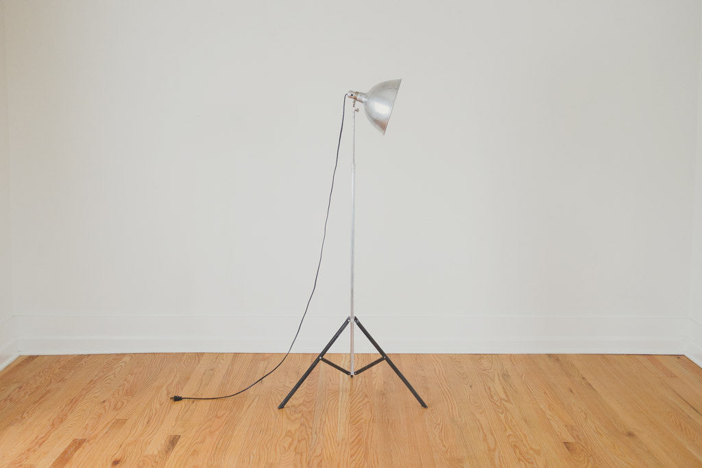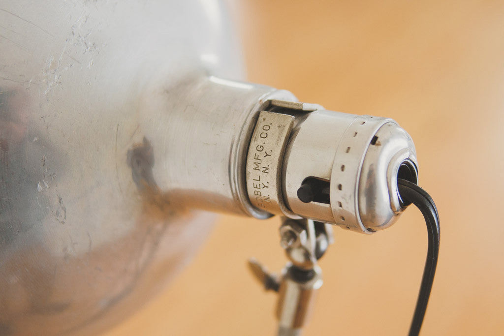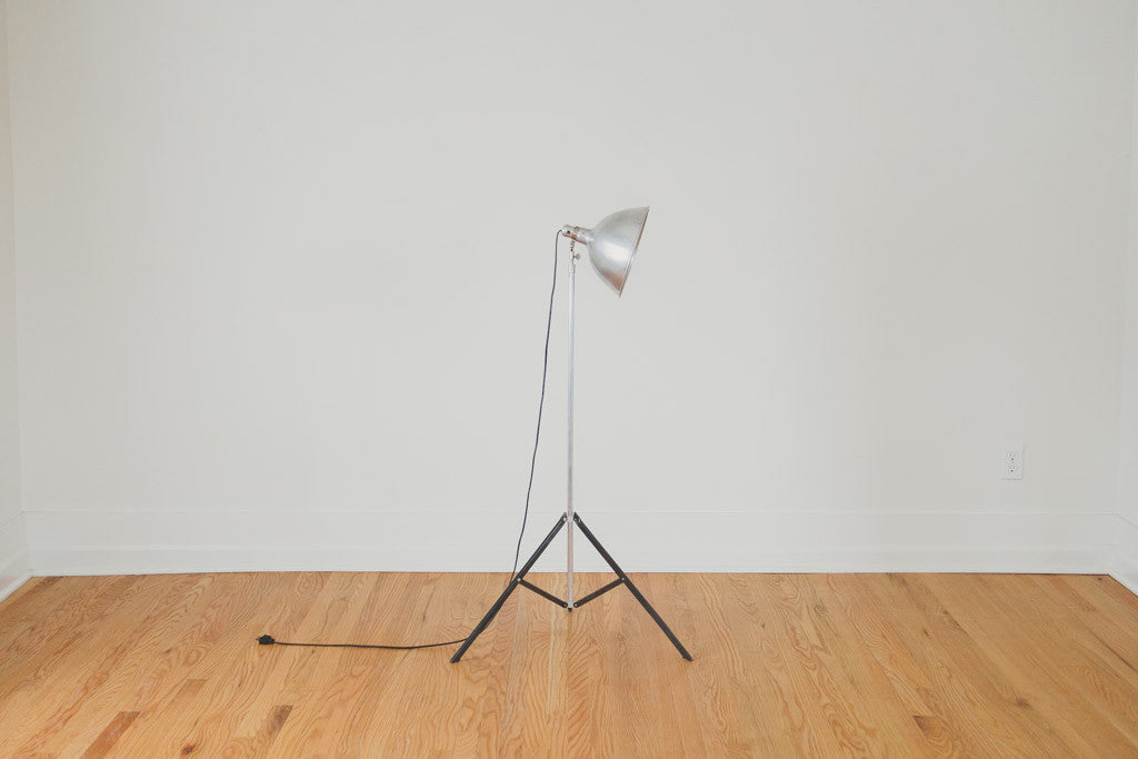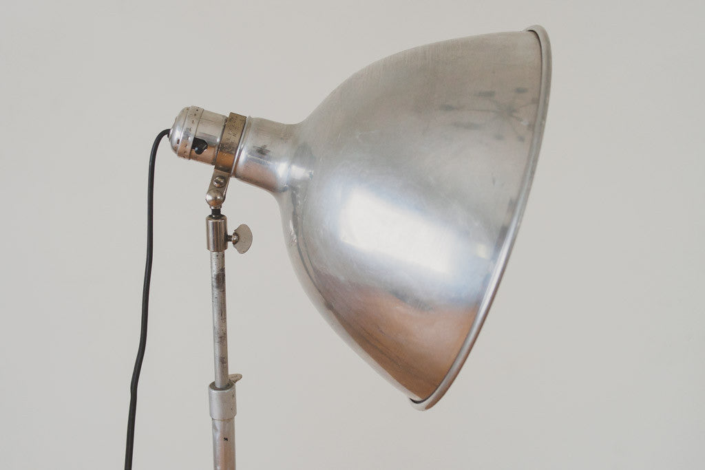 This Mid Century industrial studio floor lamp has a chrome finish with a folding tripod base. It's adjustable in direction and height. Please see pictures for detailed condition.
