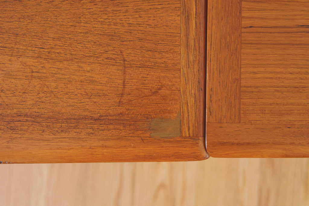 This vintage Danish Mid Century teak dining table is a Niels O. Moller for A.B.J. Mobelfabrik design. It seats four to six comfortable with two extendable pull-out leaves that seat four more. It's in great shape with age related wear. Please see pictures for detailed condition.