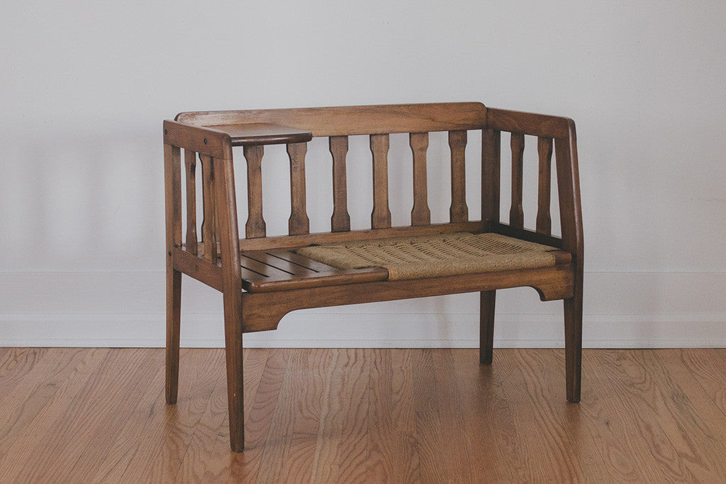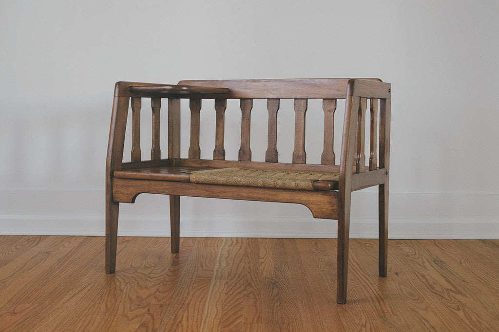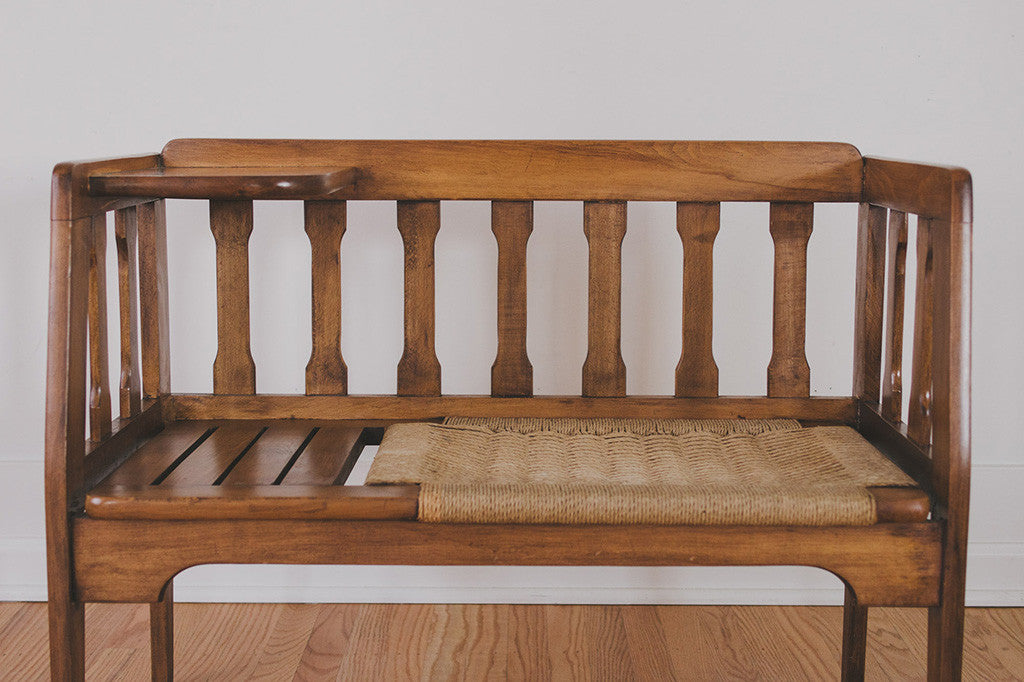 This vintage telephone bench has a dark wood frame, small writing surface and woven rope seat. It's in great shape with age related wear. Please see pictures for detailed condition.