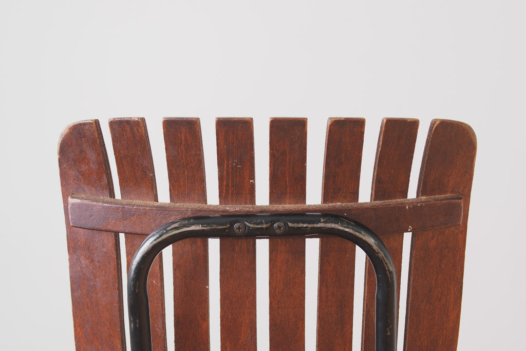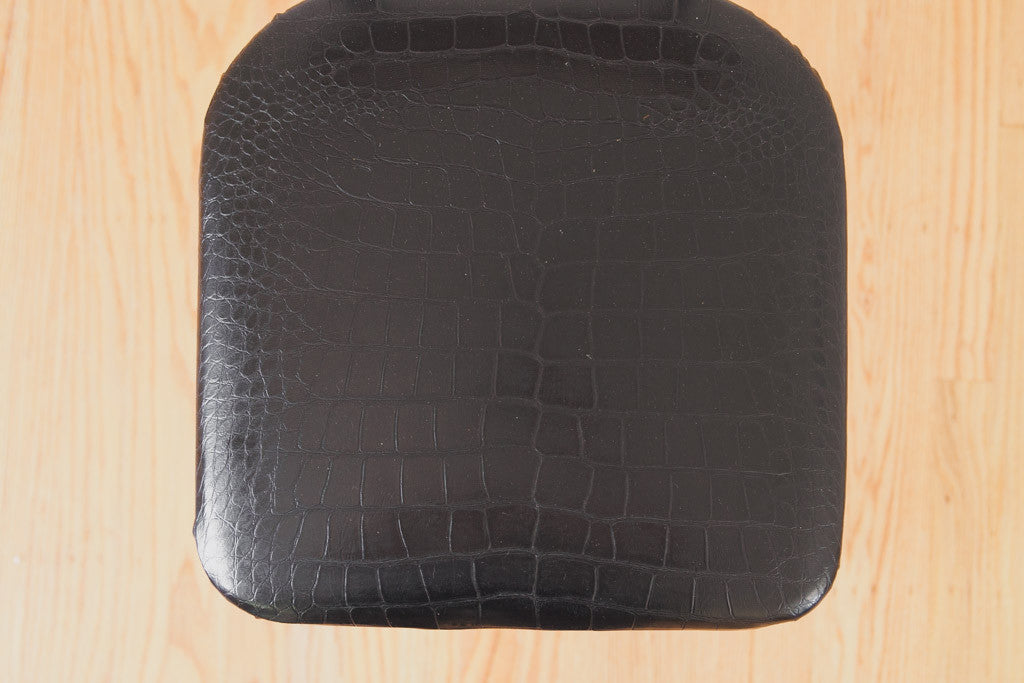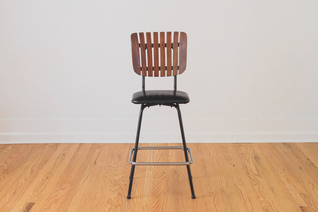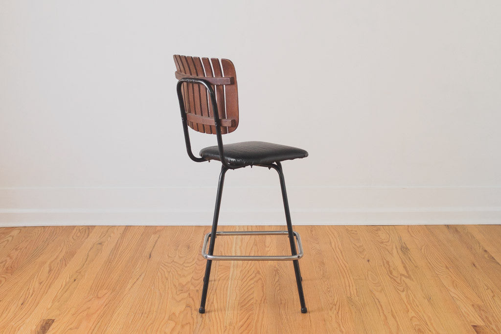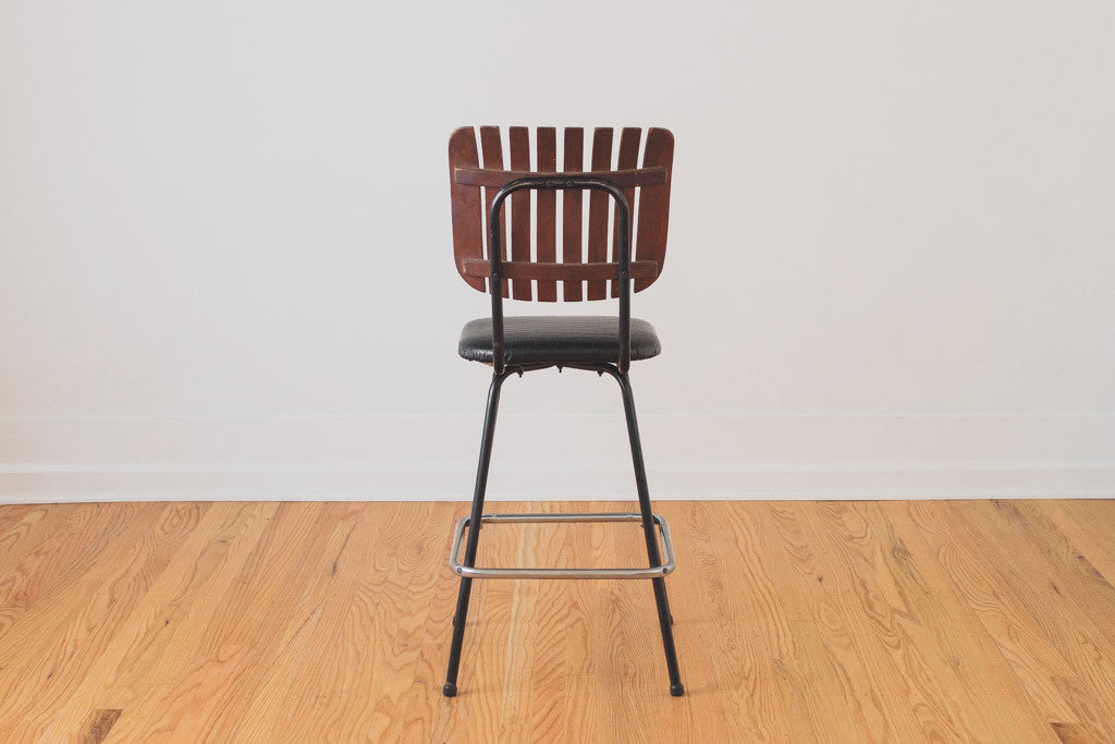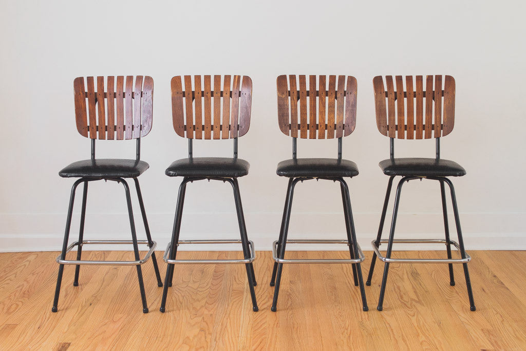 These four Mid Century bar stools have black metal swiveling frames with silver footrests, teak backrests and black alligator naugahyde upholstered seats. They're sturdy and in good shape with age related wear. Please see pictures for detailed condition.