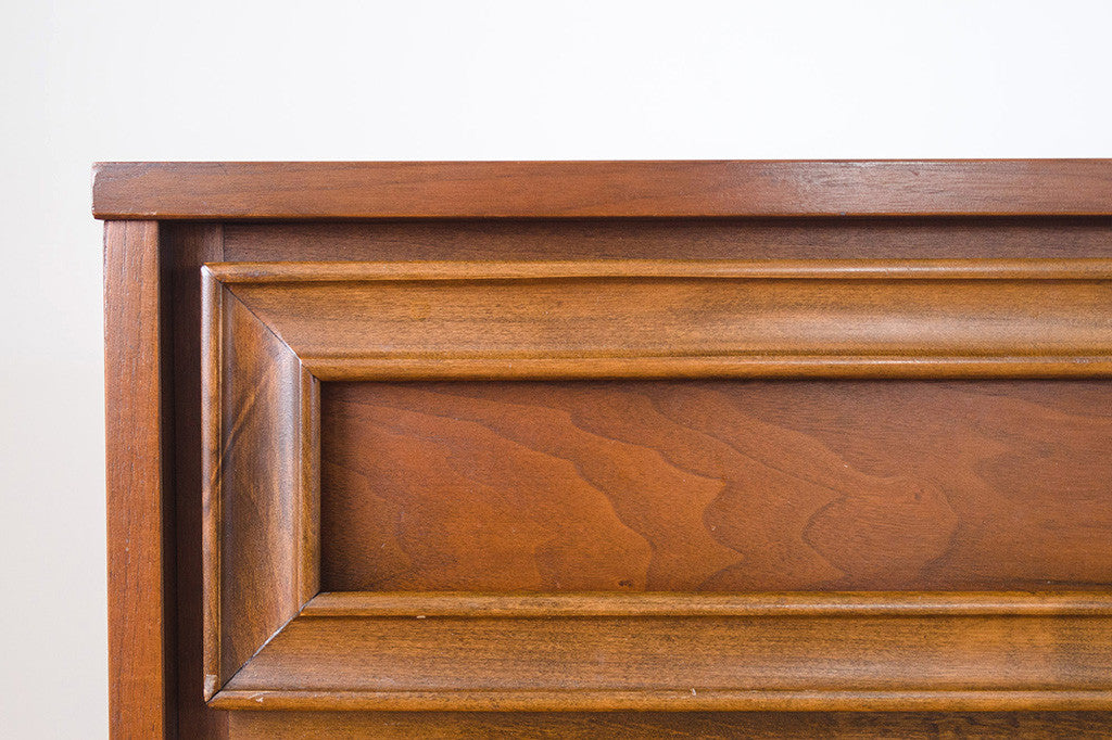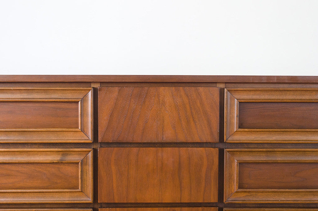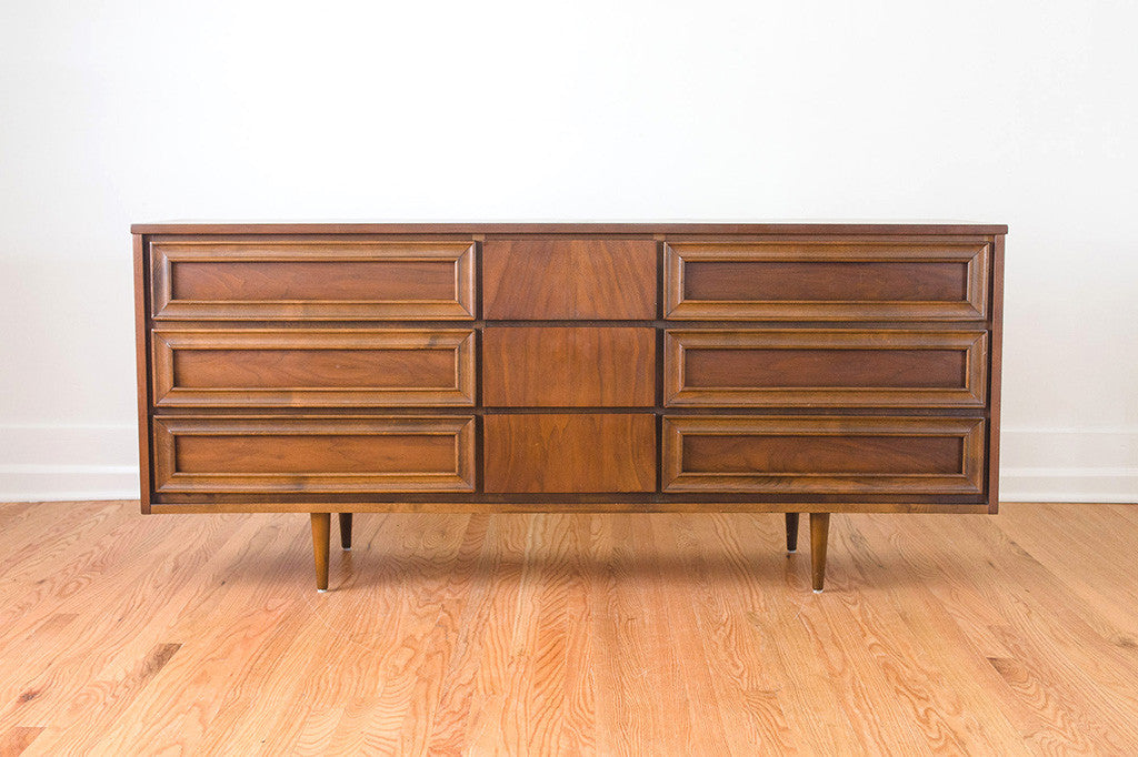 This vintage Mid Century walnut dresser was manufactured by Union Made Furniture. It's a nine drawer lowboy style with a generous amount of storage space. It has six framed drawer fronts and three smaller plain front drawers in the middle. This piece has a solid wood top and is in overall excellent condition with some light age related wear. Please see pictures for detailed condition of this piece.