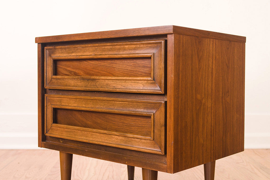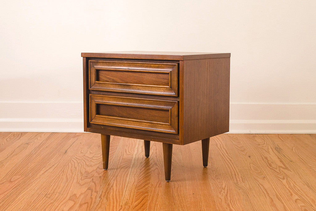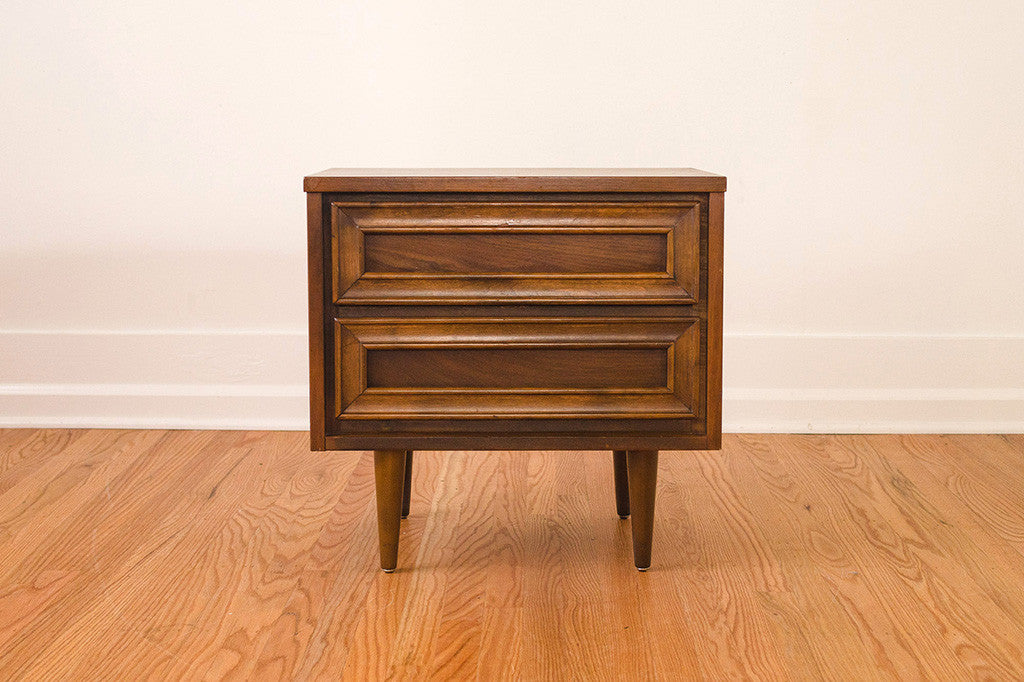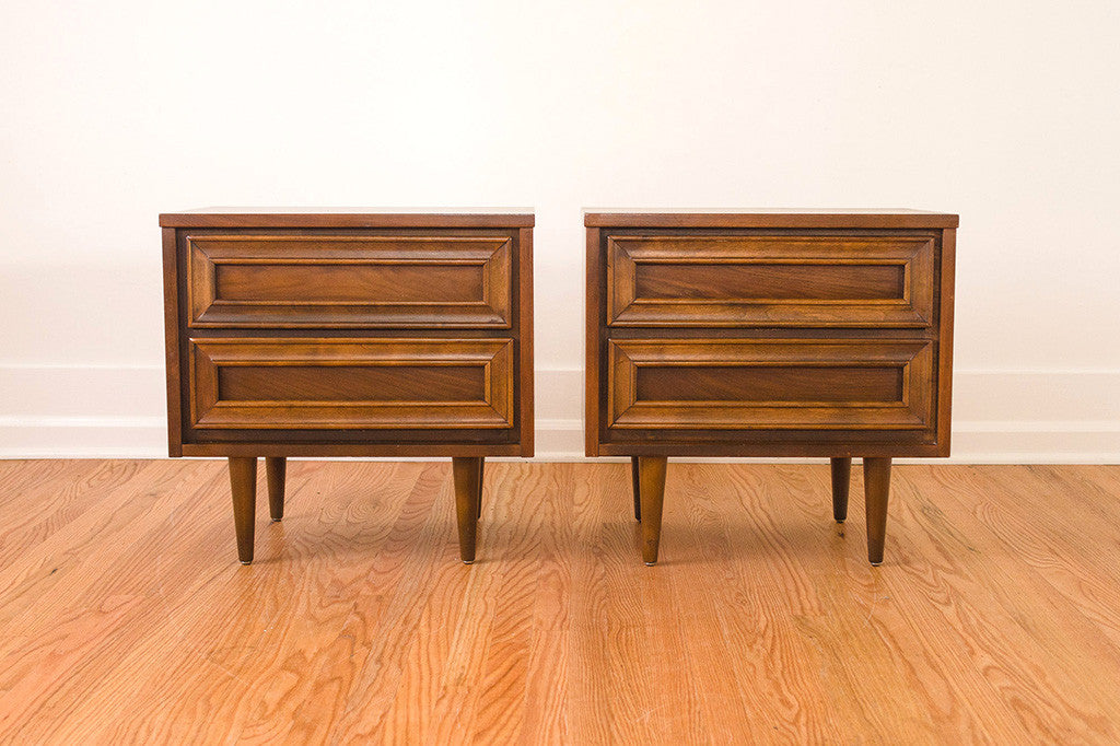 These vintage Mid Century walnut nightstands were manufactured by Union Made. They're a two drawer style with peg legs and framed drawer fronts. These pieces have solid wood tops and are in overall excellent condition with some light age related wear. The listed price is for the pair. Please see pictures for detailed condition of these pieces.